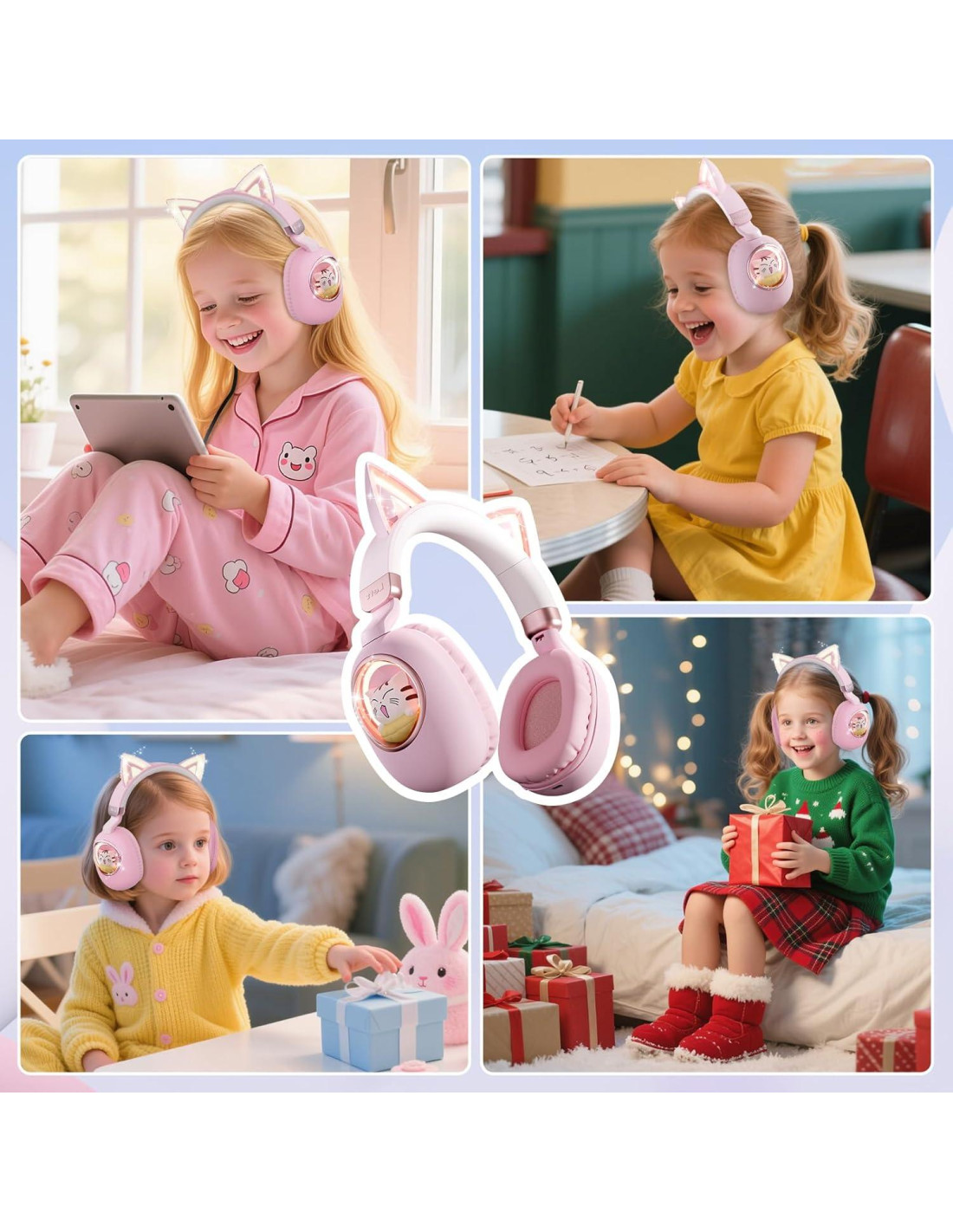 es un fabricante y vendedor profesional de auriculares para niños. Nuestra misión es proporcionar a cada niño productos seguros, de alta calidad y saludables. Con un equipo de diseñadores de auriculares expertos y más de 15 años de experiencia en fabricación, se dedica a asegurar que cada niño disfrute de una infancia feliz y colorida. ¿Son cómodos estos auriculares bluetooth para niños para usar durante largos períodos? ¡Sí! Los cojines acolchados y la diadema ajustable los hacen cómodos para niños de 3 a 12 años. El diseño ligero (0.39 kg) previene la tensión, y el estilo circumaural no presiona demasiado. ¿Es seguro el límite de volumen para los oídos de los niños? Absolutamente. Estos auriculares con cancelación de ruido para niños cumplen con el límite de volumen de 85dB (recomendado por la OMS para niños). El sonido es claro pero no demasiado fuerte, protegiendo los oídos jóvenes. ¿Se mantendrán los auriculares con orejas de gato durante el juego activo o el movimiento? Mayormente, sí. La diadema ajustable y los copas de oído ajustadas los mantienen en su lugar durante el juego ligero. ¿Es estable la conexión Bluetooth y se pueden usar con cable? Bluetooth 5.4 proporciona una conexión estable dentro de ~15 metros. Los auriculares de gato para niños también incluyen un cable AUX de 3.5mm para uso con cable, ideal para vuelos o para ahorrar batería.