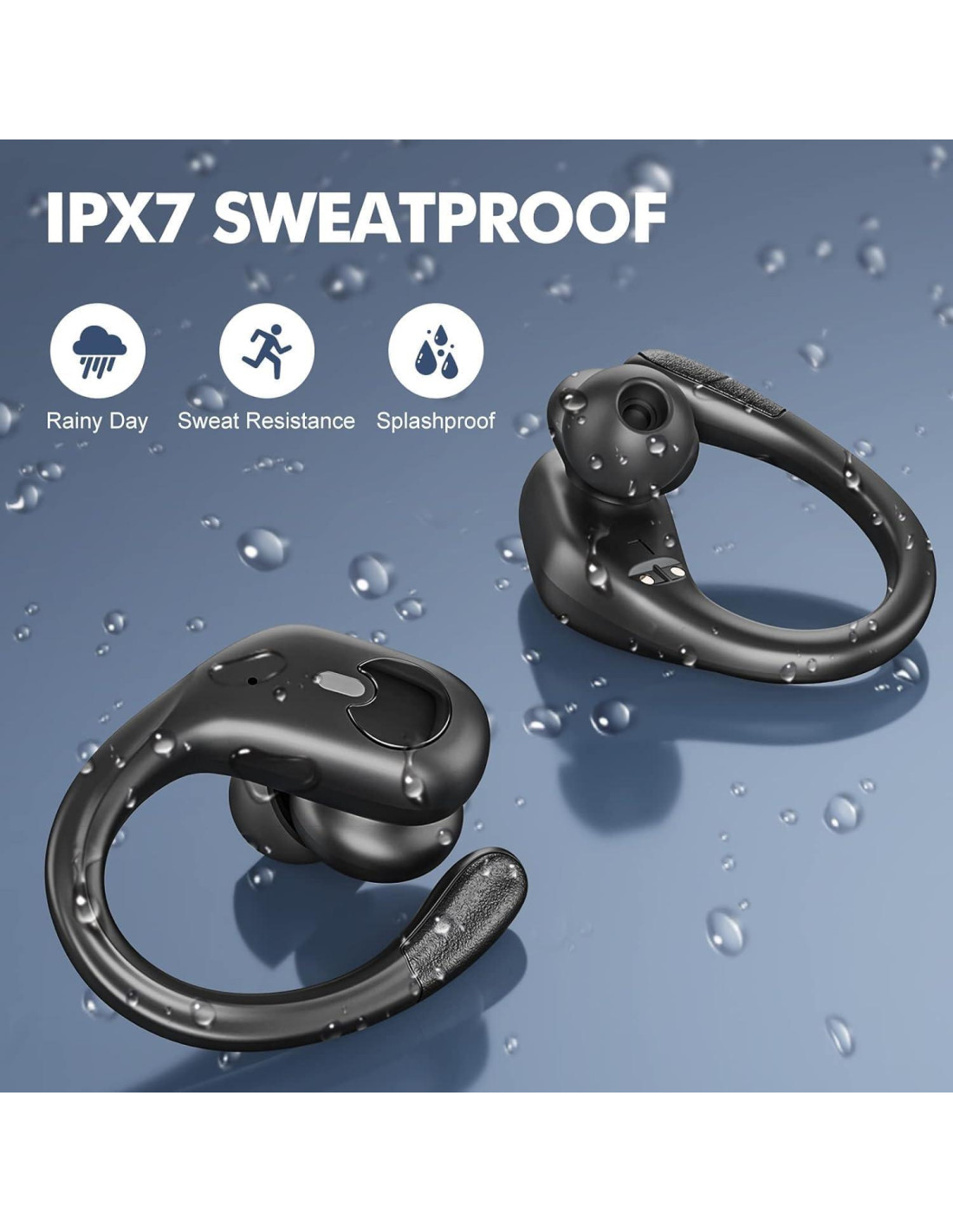 - Diseño Ergonómico para Deportes: Los auriculares deportivos cuentan con ganchos para las orejas hechos de un material TPE (elástico) innovador, el diseño ultra-ligero y ergonómico le permite usarlos durante mucho tiempo sin sentirse incómodo. Pruebe los tres tamaños de puntas para obtener un ajuste ceñido en los auriculares y crear un sellado perfecto para un sonido cristalino. Los auriculares inalámbricos bluetooth son impermeables con un recubrimiento nano IP7 para protegerlos al sudar o mojarse.