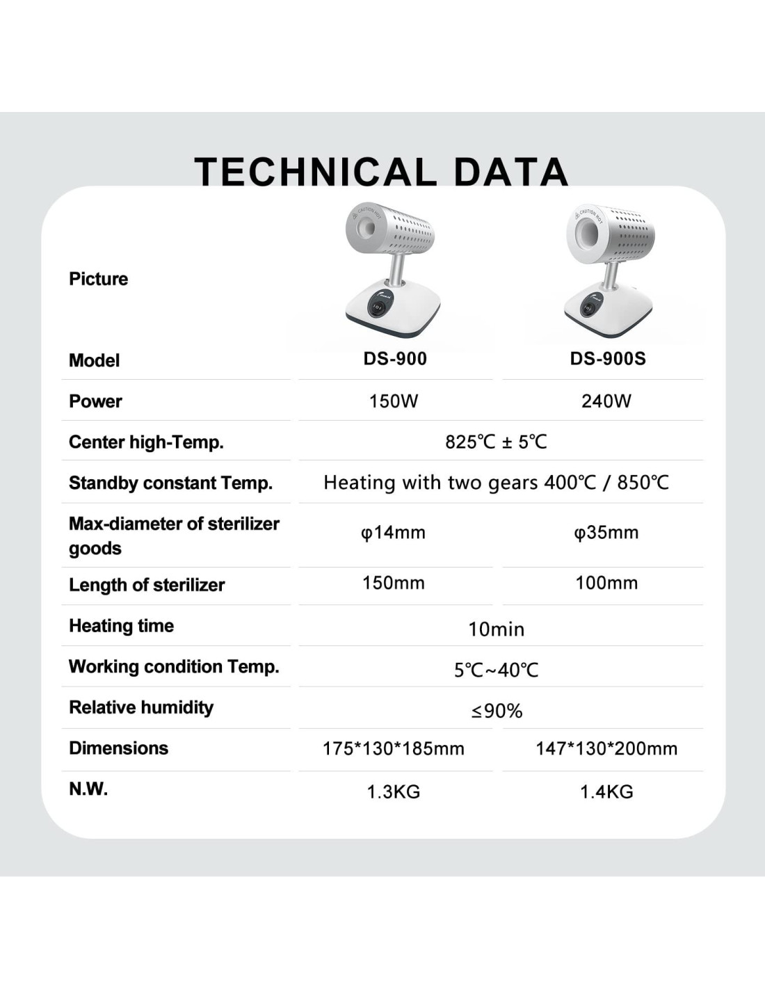 - Alto Rendimiento: La temperatura dentro del orificio de calentamiento puede alcanzar 825 C (1517 F), la esterilización solo toma de 5 a 7 segundos, la esterilización es completa.