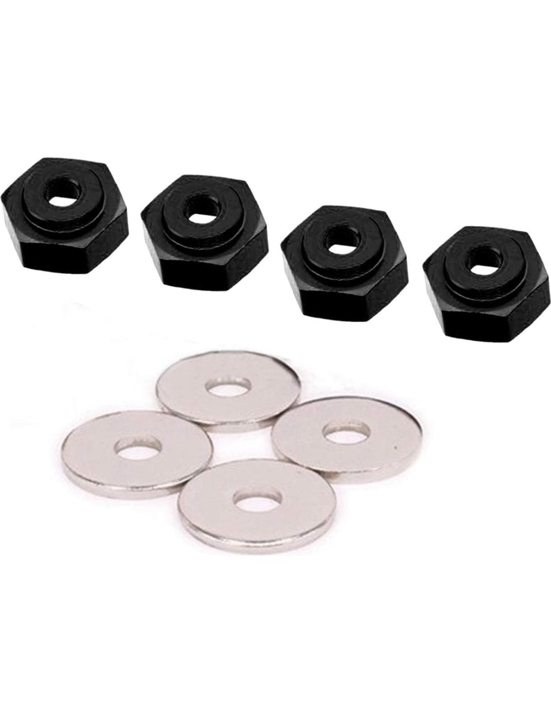 4PCS Juego de Adaptadores Hexagonales de 12mm a 17mm. Compatible con Tamiya Axial RC4WD Traxxas HPI Himoto HSP Losi Kyosho RC 1/10 Coche de Carretera Buggy Camión. Hecho de metal de alta calidad, resistente y duradero. Fácil de ensamblar. Material: Metal Color: Negro (Como se muestra en las imágenes) Contenido del paquete: 4* Adaptadores Hexagonales 4* Arandelas