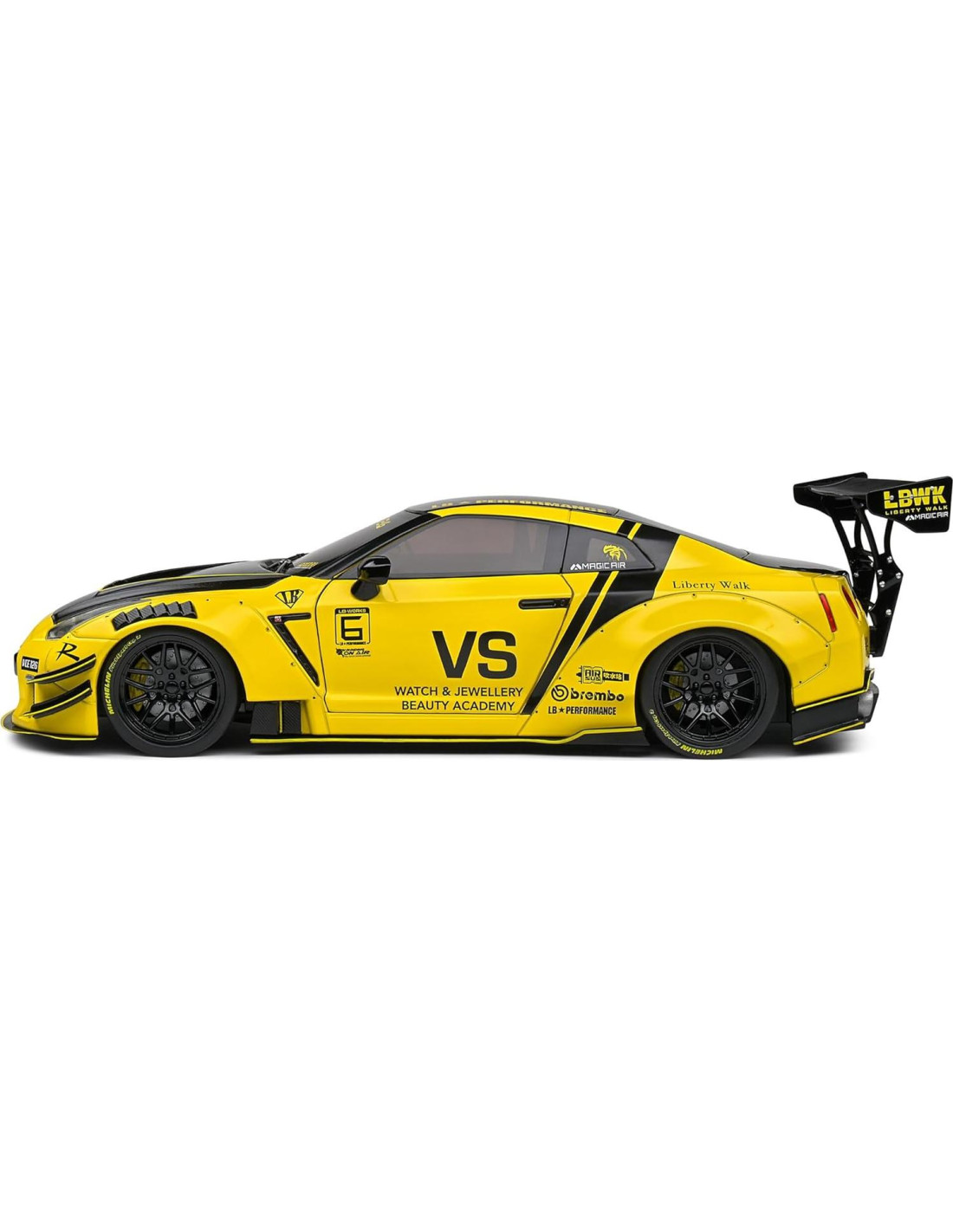 Modelo de automóvil de diecast a escala 1/18 completamente nuevo del kit de carrocería Skyline GT-R (R35) 2.0 RHD (con volante a la derecha) Amarillo con capó y techo negros por Solido S1805809