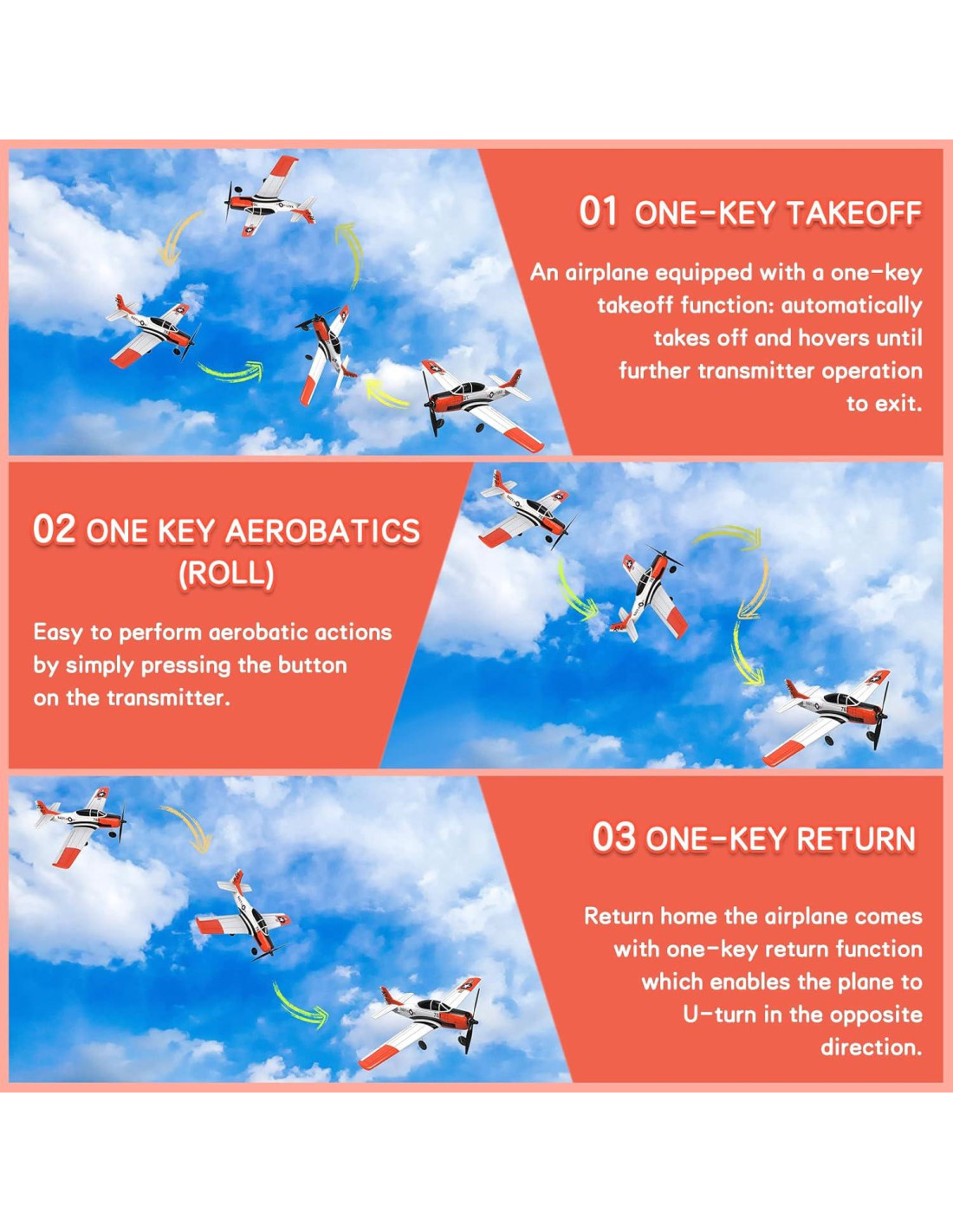 - [Acrobacias de Una Tecla] - 4-CH hace que el avión sea más jugable, puede completar una variedad de acrobacias fácilmente. La función de giro de una tecla permite que el planeador regrese automáticamente, no necesitas preocuparte por perder tu avión.