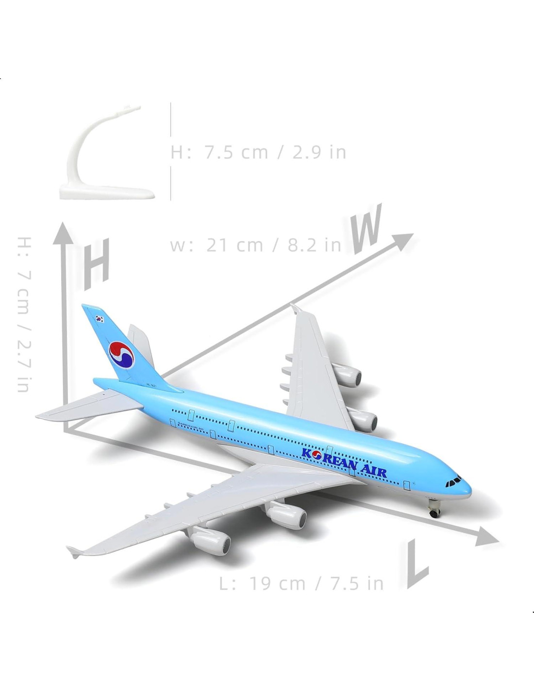- Dimensiones del Producto>- Este modelo de avión Airbus A380 está cuidadosamente elaborado a escala 1/300 basado en un avión Airbus real. Mide 7.48 x 7.95 x 2.64 pulgadas (19,05 x 20,16 x 6,70 cm) y pesa 0.44 libras (0,20 kg), mostrando la hermosa forma del Airbus A380. Hay widgets de tren de aterrizaje removibles en el vientre, lo que lo hace adecuado para colección o decoración en una estantería, mesa o vitrina.