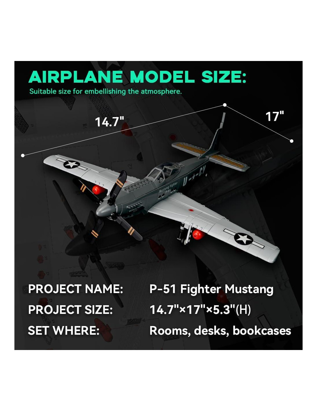 - Construye un modelo de avión caza P-51 Mustang a escala 1:26 altamente detallado, que presenta una cabina de un solo asiento, ruedas que giran y un capó transparente para una experiencia auténtica de aeronave militar.