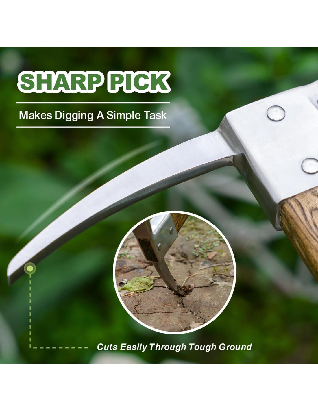 - [Diseño de Doble Cabeza] Esta herramienta de pico viene con cabezas dobles para diferentes propósitos. El extremo puntiagudo es para romper suelo duro, como suelo arcilloso pesado, grava y suelo seco y duro. Un extremo plano mientras que el extremo plano es para cavar zanjas o remover las raíces obstinadas de malezas. Perfecto para cavar, aflojar suelo, trasplantar y desmalezar en el jardín.