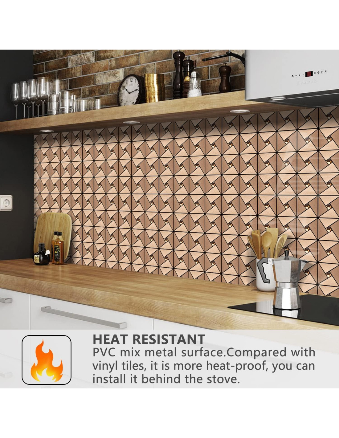 - AZULEJO DE PATRÓN DE MOLINILLO: 10 Hojas de azulejo autoadhesivo marrón de alta calidad para cocina, 30.48cm x 30.48cm x 0.30cm cada una, cubre aproximadamente 0.93 metros cuadrados. Este salpicadero autoadhesivo cuadrado facilita la instalación y reduce el desperdicio de corte. Los diseños de metal y vidrio cortados en triángulo brillantes combinan para hacer que tu hogar se vea más brillante y espacioso.