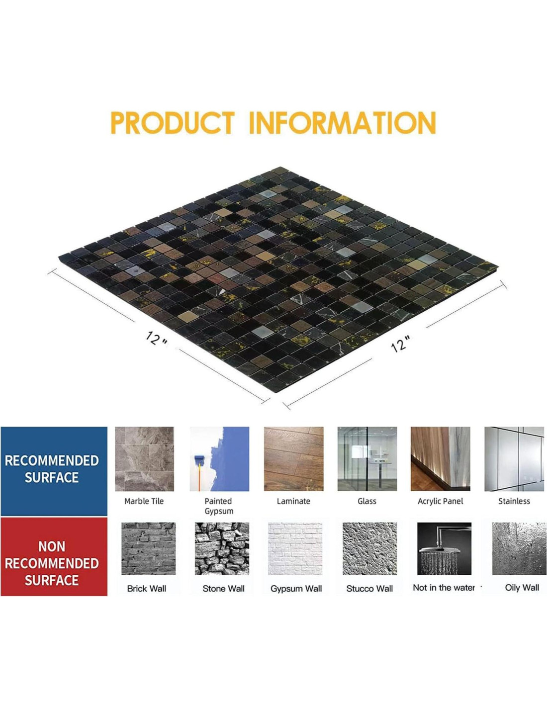 Azulejo de Respaldo Autoadhesivo sanyeskkiy, combina elementos de impresión y metal en lugar de una textura monótona, haciéndolo más moderno y popular. Este diseño cuidadoso lo hace más versátil, sacando el mejor efecto con la decoración contemporánea popular. Adecuado para respaldo de cocina, respaldo de baño y ducha, pared de sala de estar en dormitorio, decoración de chimenea, etc. Fácil de hacer tú mismo para refrescar tu habitación sin gastar mucho tiempo y dinero, puedes decorar tu hogar con un nuevo aspecto de inmediato. Tratamiento de superficie: Impresión, textura metálica, resistente a rayones, resistente al calor, resistente al agua, fácil de limpiar y quitar manchas, protegiendo las paredes del aceite y la suciedad. Cinta de espuma 3M: La cinta de espuma 3M de alta resistencia no es una broma. Es mejor medir el tamaño y determinar la posición de los azulejos antes de la instalación. Es difícil mover el azulejo después de aplicar presión sobre él.