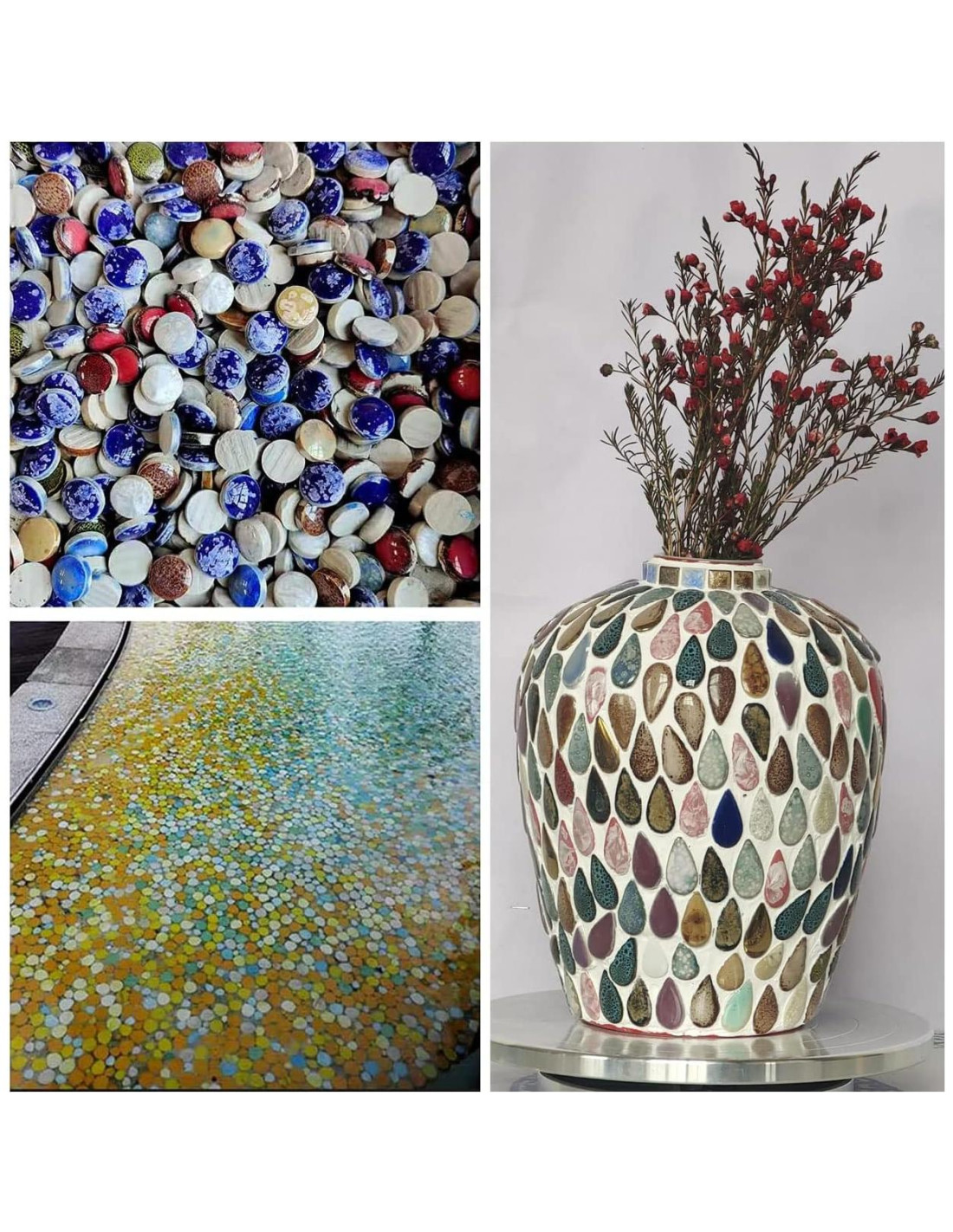 Una variedad de colores de azulejos de mosaico, estos satisfacen la demanda popular de color. - Púrpura, azul claro, azul oscuro, rojo, verde, negro, amarillo, púrpura claro, color celadón de estilo chino. También hay colores mezclados que combinan un poco de cada color (60% de las personas eligen). ¡Hay muchas formas y estilos para elegir en esta lista! - Ovalado, Redondo, Gota, Hoja, Irregular, Cuadrado. Siéntete libre de elegir, siéntete libre de combinar.