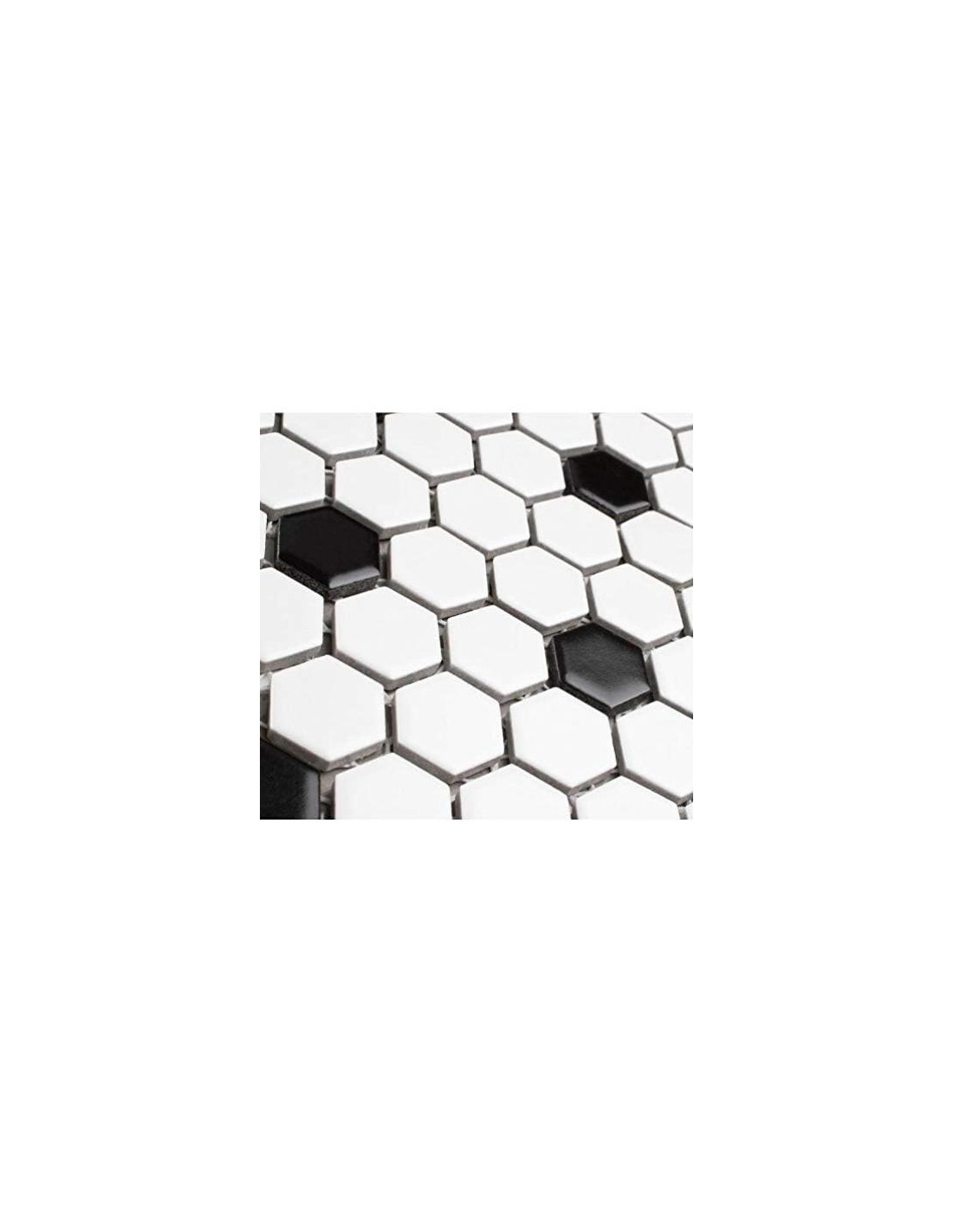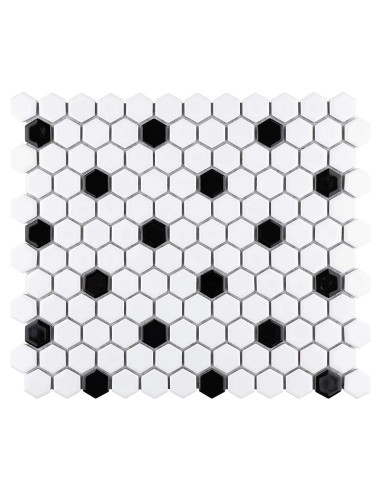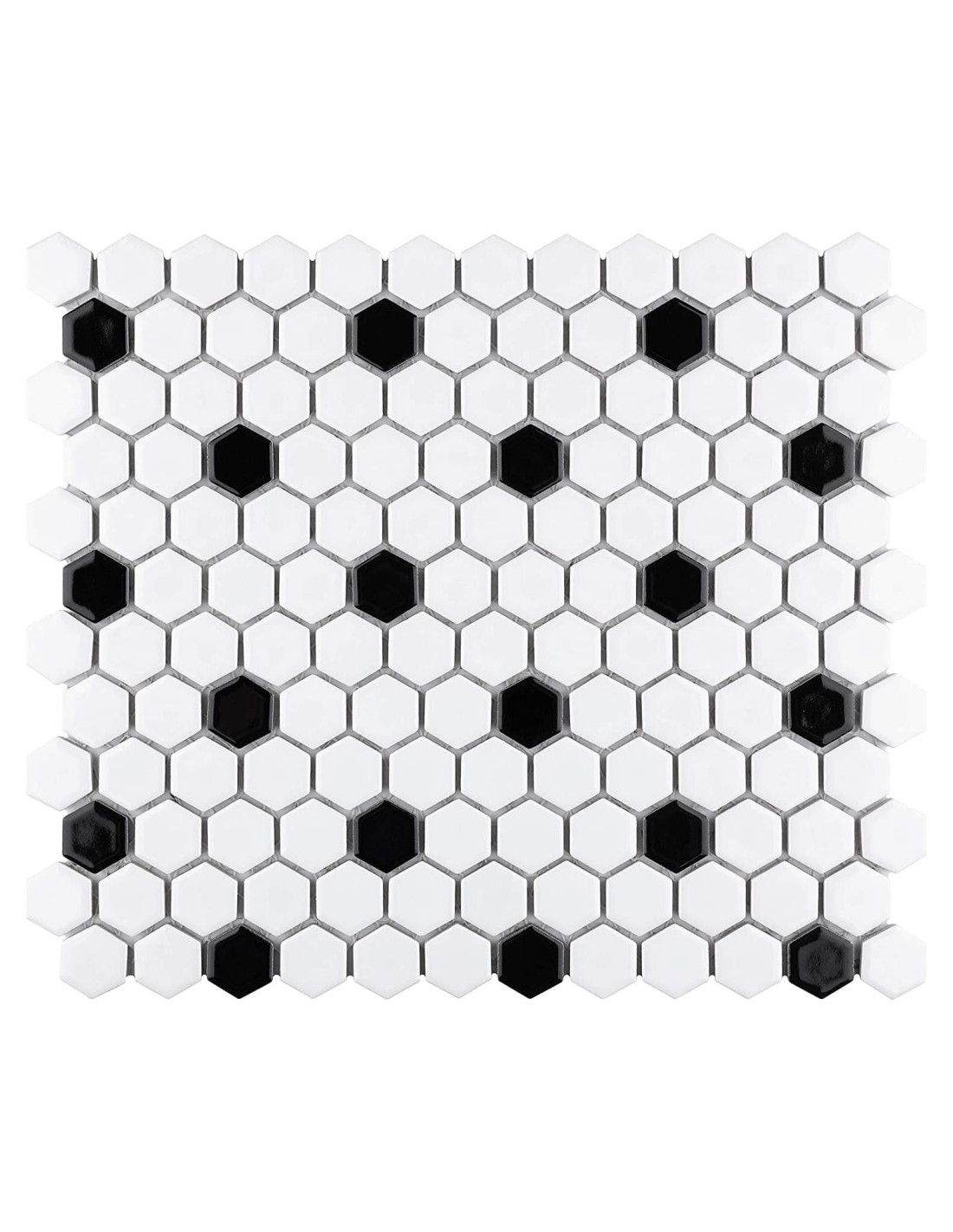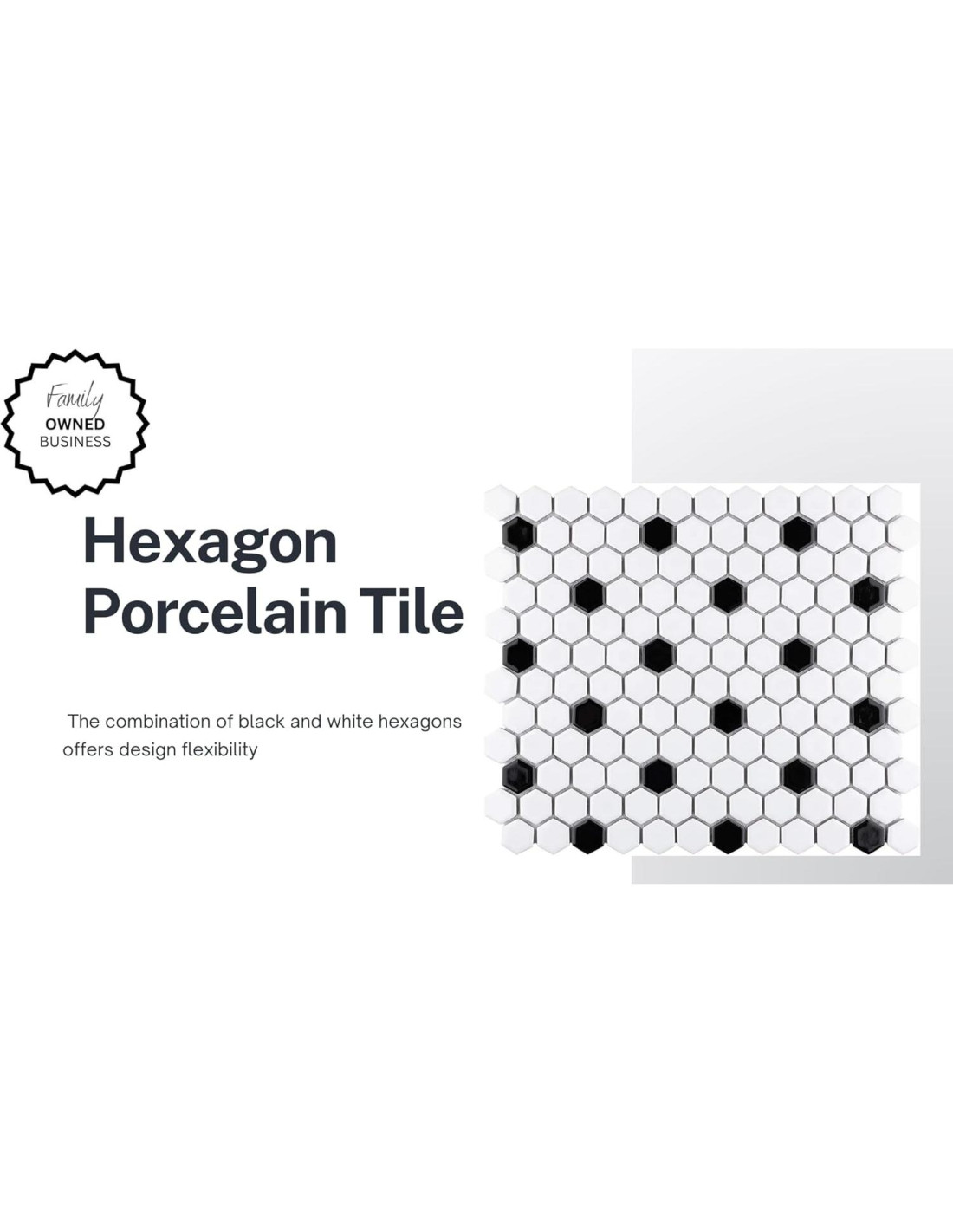 - Los azulejos hexagonales de porcelana en blanco y negro ofrecen una opción de diseño elegante y versátil para pisos, paredes y backsplashes. La forma hexagonal, combinada con el clásico esquema de color blanco y negro, crea un patrón visualmente interesante que puede adaptarse a una variedad de estilos de diseño, desde moderno hasta clásico.
