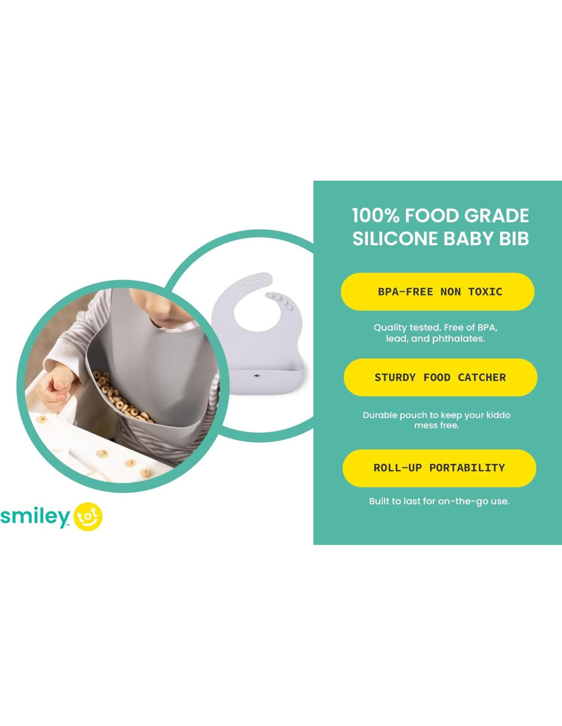 El babero de silicona de SmileyTot está hecho con un duradero atrapador de comida. Libre de BPA, ftalatos y plomo. Los baberos SmileyTot están hechos de 100% silicona que es apta para lavavajillas y microondas. Los baberos de silicona SmileyTot están diseñados con una función de enrollado para una portabilidad fácil y segura. Este babero impermeable y ajustable mantiene a su bebé o niño pequeño limpio y sin desorden.