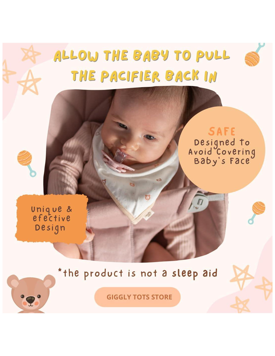 - Giggly Tots Sujetador de Chupete permitirá que tu Bebé recupere el chupete de manera segura cuando se caiga, reduciendo la necesidad de tu intervención. También ayudará a tu Bebé a mejorar su técnica de succión para que el chupete no se caiga de la boca de tu Bebé. Este proceso, sin embargo, toma tiempo, así que sigue intentándolo. ¡Solo espera y verás!