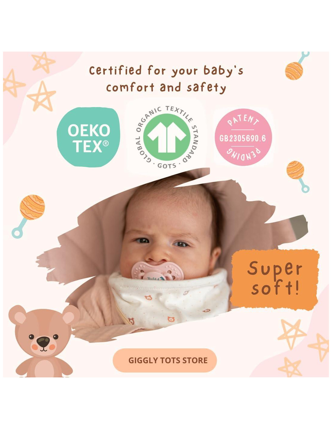 - El Babero Sujetador de Chupete está diseñado por Ingenieros de Productos Británicos y tiene certificaciones de laboratorios globales líderes. Cumple con las normas de seguridad, cuenta con certificación GOTS por el uso de 100% Algodón Orgánico y certificación OEKO-TEX por la ausencia de sustancias nocivas. Ten la seguridad de que GigglyTots prioriza tanto la calidad como la seguridad para tu pequeño.