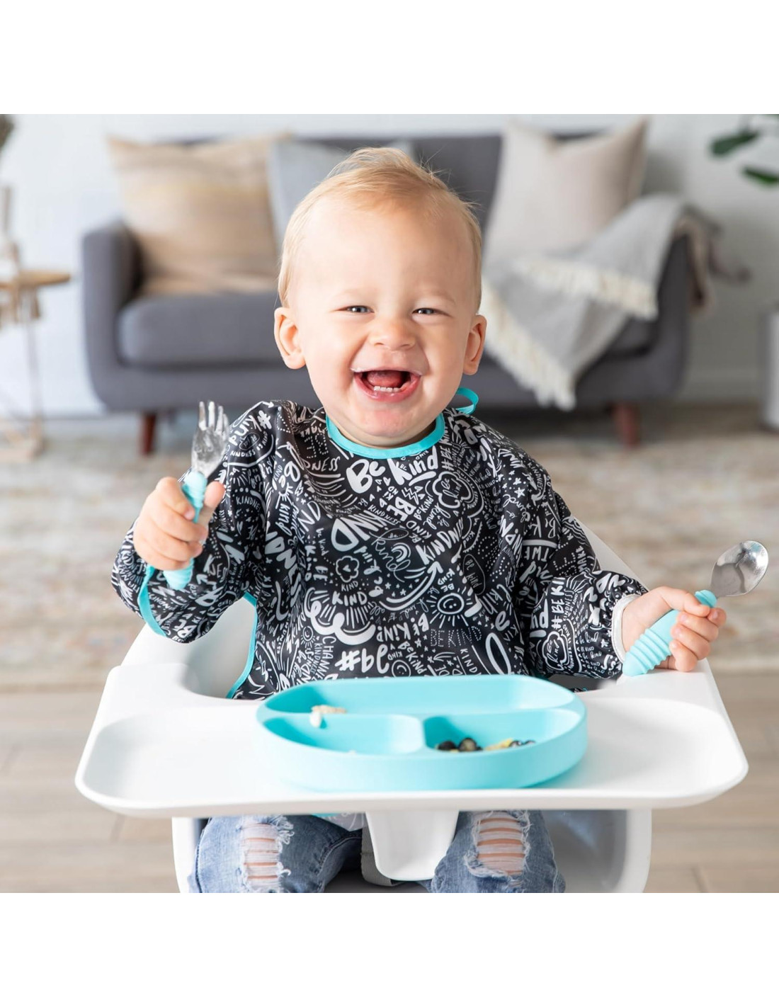- SIN MÁS DESORDEN - Ajustable para crecer con tu pequeño, este babero tipo smock presenta un cierre en la parte posterior con puños elásticos suaves, manteniendo las mangas en su lugar y libres de derrames. El gran bolsillo recolector ayuda a contener migajas, derrames y más, manteniendo el desorden alejado de tu bebé y del suelo.