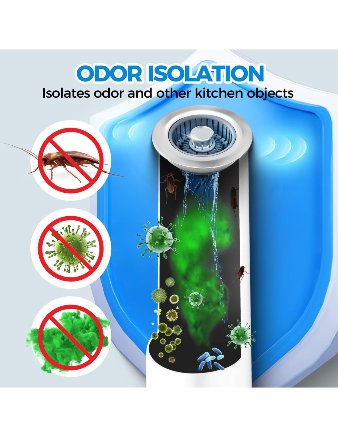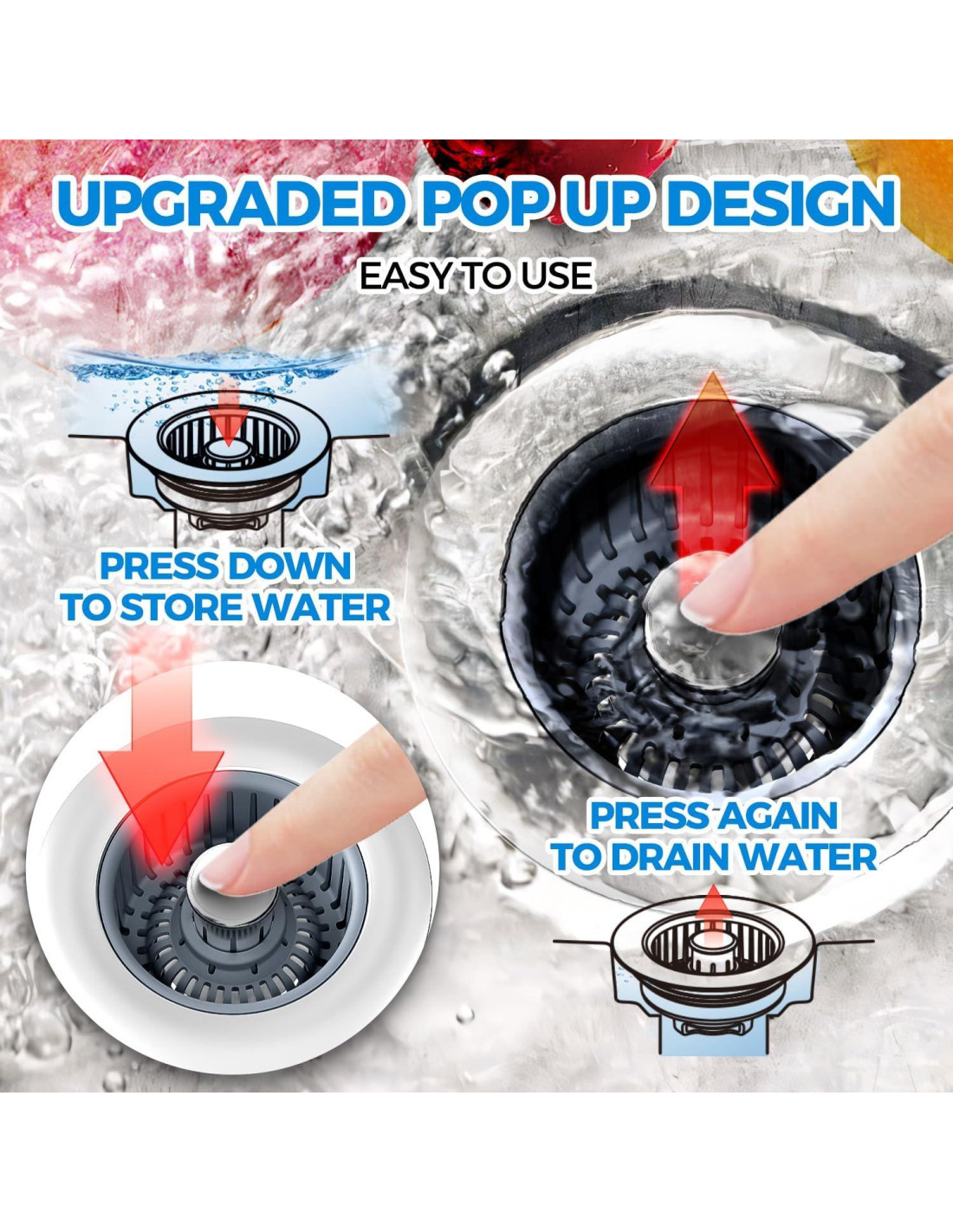 - [Filtro de desagüe de fregadero de cocina 3 en 1 mejorado] Nuestro filtro de fregadero de cocina combina el filtro de desagüe de fregadero, el tapón de fregadero de cocina y la aislamiento de olores. Presione el botón emergente para almacenar agua para lavar, presione nuevamente para drenar agua mientras atrapa desechos de comida o restos que van por el desagüe. Un confiable ayudante anti-obstrucción