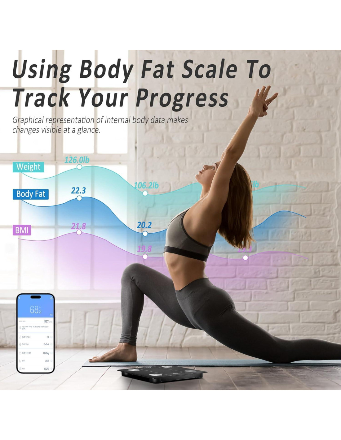 - Conveniente y Ahorro de Energía: Nuestra báscula corporal cuenta con calibración automática, lo que significa que se ajusta sola cuando te subes a ella, asegurando lecturas precisas cada vez. Además, se apaga automáticamente después de las mediciones, extendiendo la vida de la batería y mejorando la durabilidad. Esta característica conveniente te ahorra tiempo y esfuerzo.
