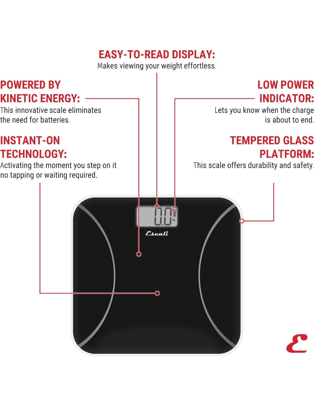 - Alimentada por energía cinética, esta innovadora balanza para peso corporal elimina la necesidad de baterías, simplemente sube y está lista para pesar.