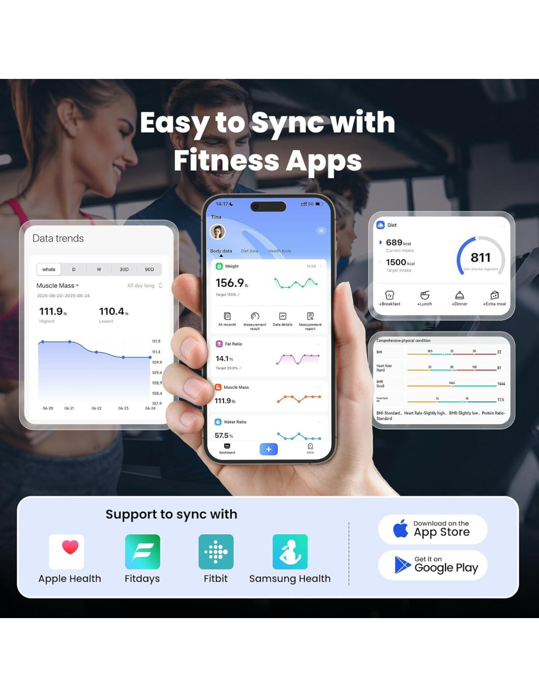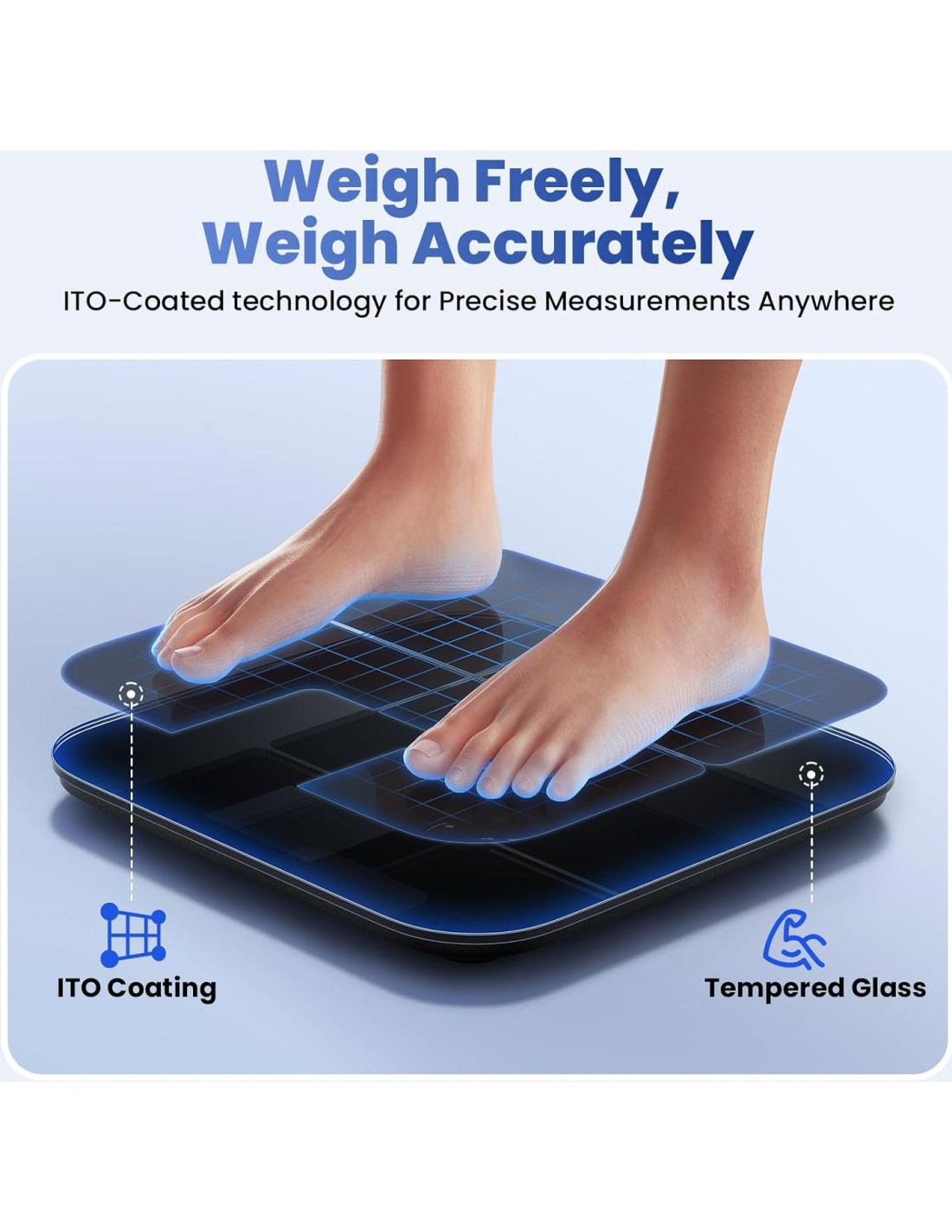 - Tecnología Avanzada de Precisión ITO: Con cuatro sensores de alta precisión y un recubrimiento completo de ITO, la báscula con IMC, grasa corporal, masa muscular proporciona una precisión de peso de 0.1 lb (0.045 kg) y datos de grasa corporal (hasta 181 lb). El área de detección de ITO para los pies se adapta automáticamente a cualquier tamaño de pie para lecturas precisas cada vez.