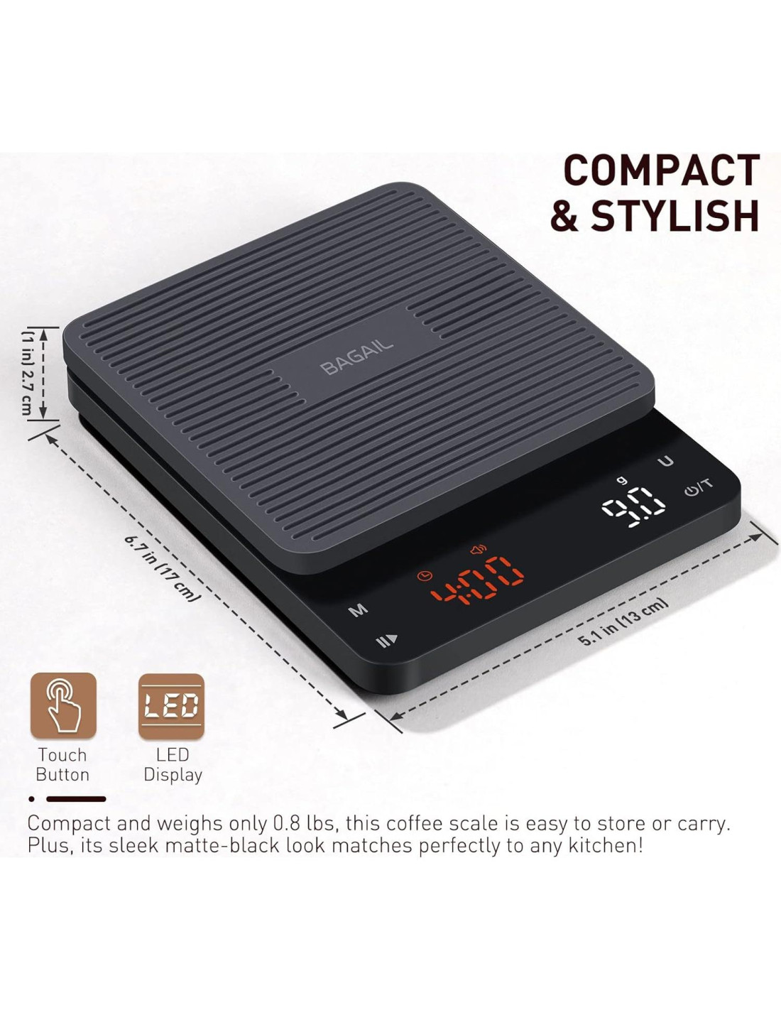 - Perfecta para Goteo: Mide 17 cm * 13 cm * 2.5 cm con un peso de 0.36 kg. Con un diseño de plataforma grande, es ideal para usar como balanza de café de goteo