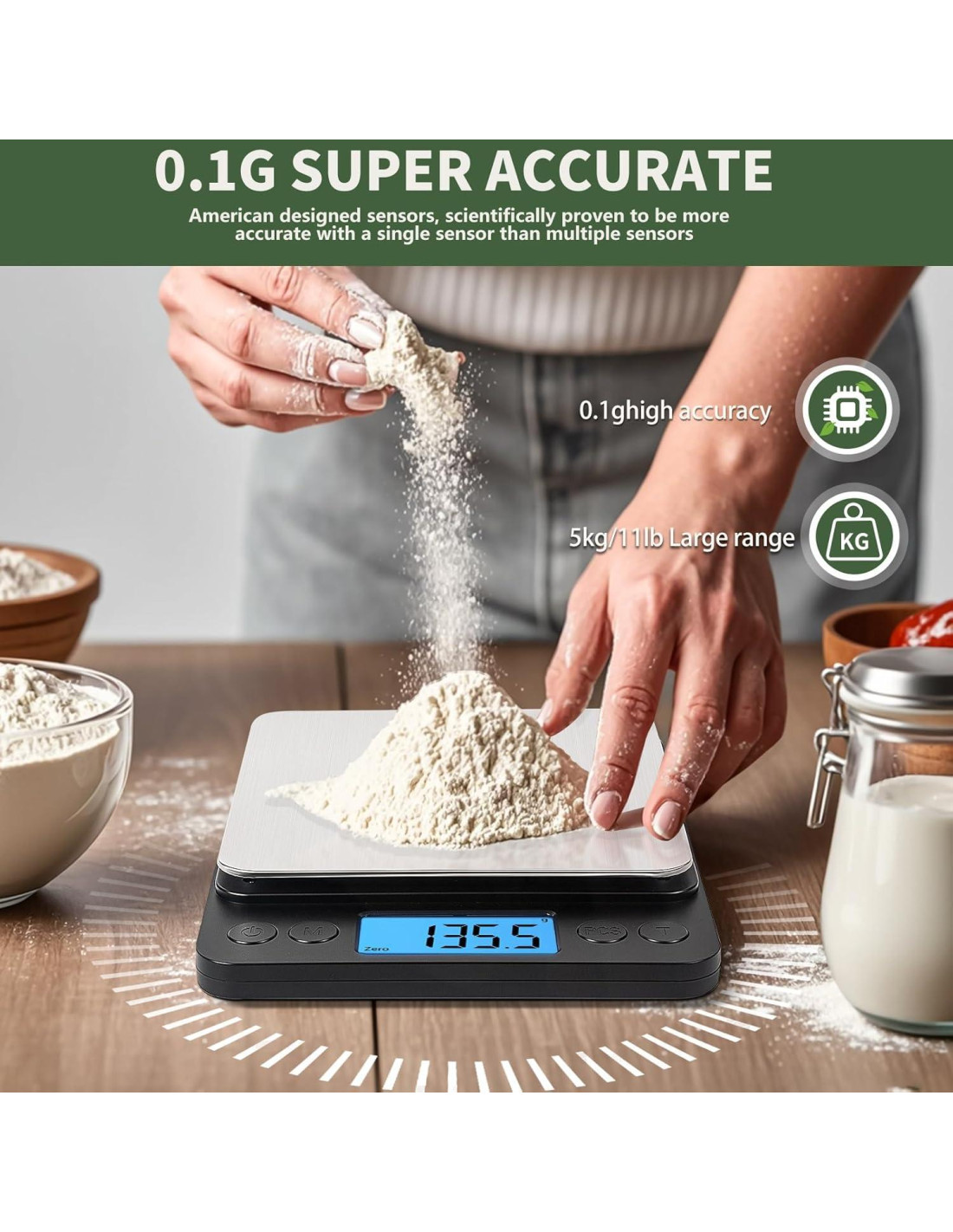 - 0.1g Súper Preciso: La escala de cocina adopta un sensor de alta precisión diseñado en EE. UU., proporcionando una resolución de 0.1g y un rango de medición de 0.5g-5kg, con una resolución de 0.1g, lo que garantiza mediciones precisas cada vez, la escala digital se utiliza ampliamente en repostería, cocina, pesaje de alimentos, café, té y preparación de cócteles, comida para mascotas, realización de pruebas, etc., para asegurar que satisfaga las necesidades de más personas que aman la vida.