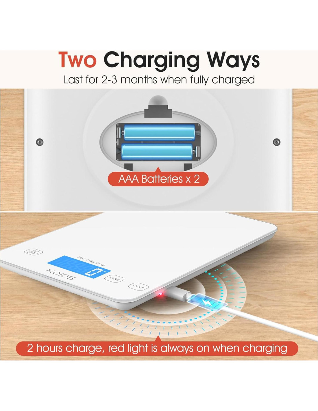 - [Batería & Carga Tipo-C] Alimentada por un puerto Tipo-C y viene con 2 baterías AAA, tienes más opciones para cargar. Presiona una vez para encender, mantén presionado 3s para apagar. La balanza de cocina se apaga automáticamente si el peso mostrado permanece sin cambios durante 3 minutos.