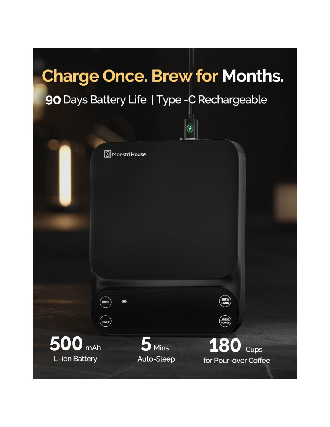 - [Cargar Una Vez, Preparar Durante Meses] Mantente ecológico y eficiente con la batería de litio de 500mAh incorporada, que ofrece hasta 90 días de uso con una sola carga USB-C. Esta balanza de espresso recargable elimina las baterías desechables, manteniendo tu estación de café limpia, ordenada y lista para tu próxima preparación