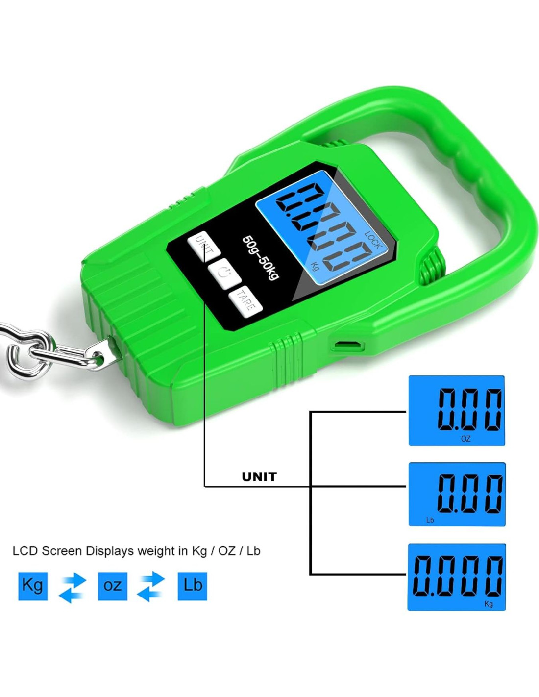 Asegúrate de que tu equipaje esté libre de cargos por exceso de equipaje. Esta báscula de equipaje ayuda mucho en tu viaje, ayudándote a reducir la lista de cosas que llevamos y a tomar decisiones más sabias. Evita pagar cargos por exceso de equipaje, ahorra tiempo y no necesitas volver a empacar en el aeropuerto. Nuestra báscula para pescado te permite pesar peces de 0.11lb(50g) a 110lb(50kg)! Esta báscula de pesca es realmente precisa y su diseño pequeño y portátil cabe perfectamente en tu caja de aparejos. Cuando vayas de compras al supermercado o envíes un paquete, obtén un pesaje instantáneo con esta báscula colgante digital. Esta báscula colgante digital es incluso un buen ayudante cuando trabajas en granjas y ranchos, ayudándote a pesar inmediatamente el peso de los cultivos o la leche. Visión Nocturna con Retroiluminación: En exteriores, si no puedes leer tus básculas de pescado en condiciones oscuras, nubladas y en días brillantes y soleados, no estarás contento con ellas. Nuestras grandes pantallas LCD con funciones de retroiluminación te ofrecen una lectura clara en diferentes iluminaciones o en condiciones de poca luz. Función de Tara: Si necesitas el valor de las frutas en esta canasta. Puedes hacer esto: Engancha la canasta vacía y presiona el botón "Tara"; luego pon las frutas dentro. Y obtendrás el peso de estas frutas. Función de Bloqueo de Datos: Después de obtener los datos de peso, "Mantener" se mostrará en la pantalla LCD. Puedes quitar los objetos en este punto y aún podrás leer el valor que acabas de obtener. Compacta, Portátil pero Robusta: La báscula digital compacta y bien construida ayuda a ahorrar espacio en la mochila. Gancho Fuerte: Equipado con un gancho niquelado, proporciona una forma alternativa de sostener tu captura de manera segura y te permite liberar fácilmente el pez cuando hayas terminado de pesarlo. Mango Ergonómico: Equipado con un mango ergonómico de gran tamaño, proporciona un agarre superior, hace que la báscula digital sea fácil de usar y mantiene tus manos cómodas durante tu viaje de pesca. Se sostiene en tu mano de manera más cómoda y robusta debido al mango más ancho y al gancho más grande. Engancha el objeto más rápido para un pesaje más rápido. También es conveniente sostener el mango a mano sin dejar dolor ni marcas. A diferencia de la mano de metal de otras básculas de pesca.