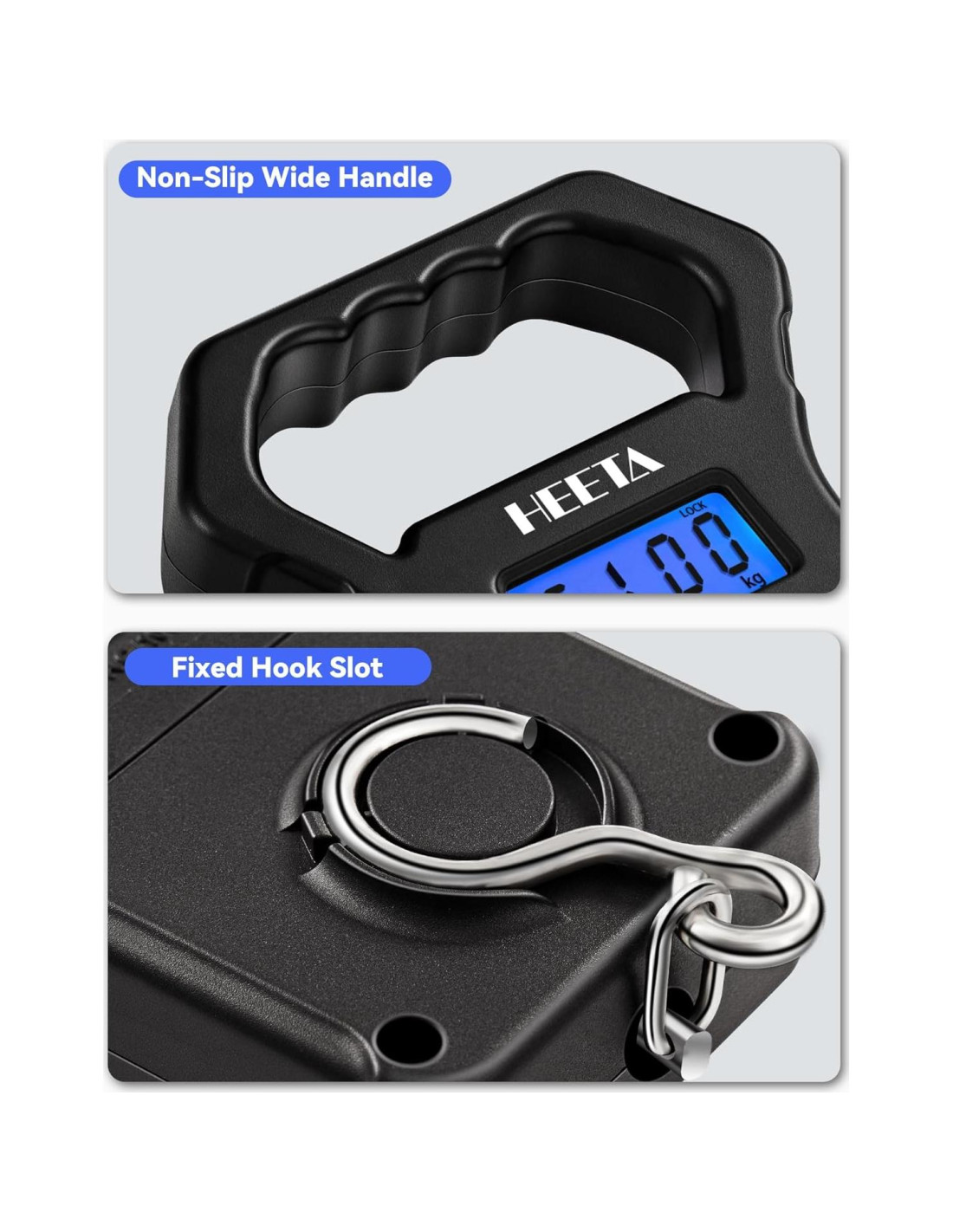 - Pesaje Preciso - La balanza de pesca HEETA proporciona mediciones precisas y confiables y puede convertir en 3 unidades de lb a oz o kg según tus necesidades. Puede pesar tanto capturas pequeñas como grandes ya que su capacidad de peso es de 0.11lb (50g) a 110lb (50kg). Levanta la balanza de pescado verticalmente y después de que los datos de medición sean estables, se bloqueará automáticamente.