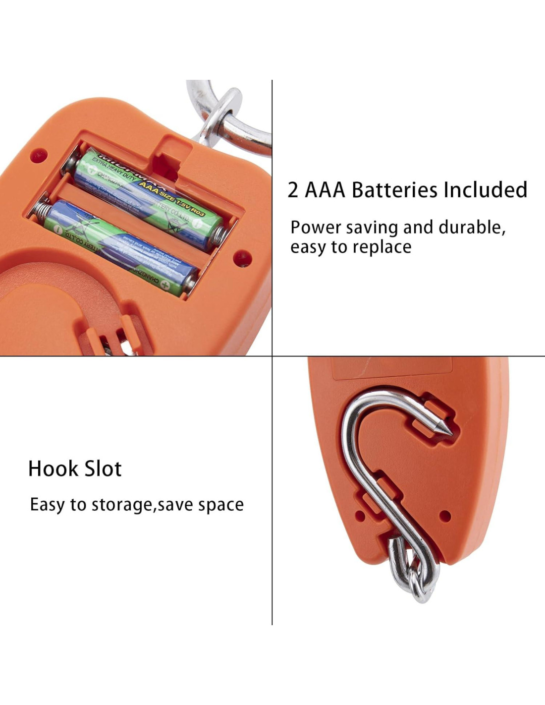 - Uso Amplio: Esta balanza digital colgante está diseñada para ser ligera y compacta, lo que la hace altamente portátil. La balanza puede usarse en agricultura, caza, pesca, taller, almacén, industrias y mucho más. Cuenta con un conveniente espacio de almacenamiento para el gancho en la parte posterior, permitiéndote mantener el gancho seguro cuando no está en uso