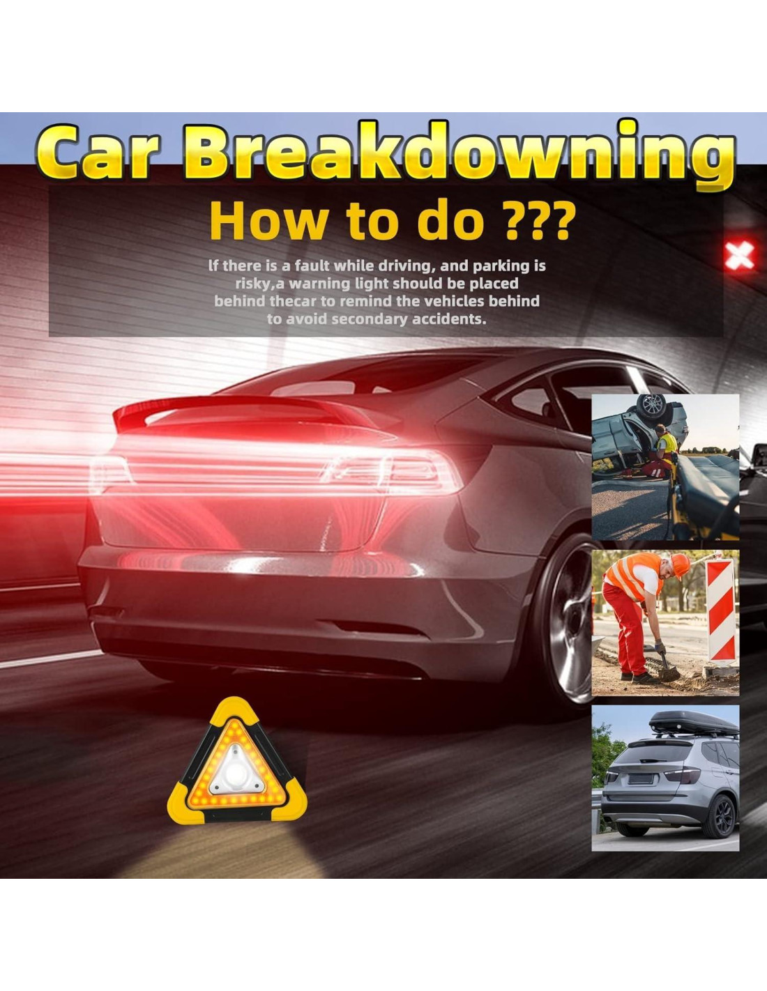 Triángulo Reflectante LED de Emergencia - Triángulo de Advertencia de Emergencia para Seguridad en el Lado de la Carretera - Fuegos de Tráfico para Estacionamiento, Aeronaves y Direccionamiento de Tráfico Nocturno - Tecnología de Luz Ambiental Perfecto para reparación de automóviles, luz de camping, senderismo, luz de barbacoa, exploración al aire libre, iluminación de emergencia, luz de trabajo de propósito general, asistencia en carretera, etc. Función de Carga El cuerpo de la lámpara también cuenta con un puerto de salida USB (5V 1A), y puede cargar su teléfono inteligente u otros dispositivos móviles en emergencia 4-Modos La luz tiene 4 modos de iluminación: Alta luminosidad, Baja luminosidad, Brillo rojo y SOS, satisfaciendo sus diferentes necesidades. Especialmente la luz de advertencia de peligro de triángulo resistente a la intemperie, modelo SOS de 36 LED, utilizada para rescate en carretera Impermeable Viene con clasificación de impermeabilidad IP65, lo que significa que puede estar protegida contra salpicaduras de agua desde todos los ángulos, adecuada para entornos interiores o exteriores, como un día lluvioso Uso Amplio La luz está equipada con un mango de soporte flexible, y puede manejarla para trabajar, hacer senderismo, acampar, cazar, explorar y buscar, etc. Especificaciones: Potencia: 30W Modo de Iluminación: Brillo Completo, Baja Luminosidad, Brillo Rojo y SOS Tiempo de Descarga: 4-6 hrs. (de brillo completo), 7-8 hrs. (de baja luminosidad) Clasificación de impermeabilidad: IP65 Material: Aluminio + ABS + PC Dimensiones: 17.95*17.95*17.95 cm Peso: 0.30 kg