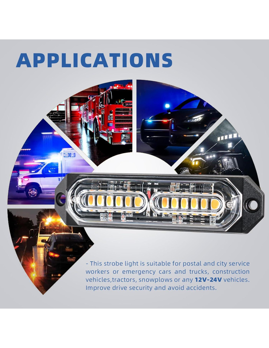 - APLICACIONES - Esta luz estroboscópica es adecuada para trabajadores de servicios postales y de la ciudad o vehículos y camiones de emergencia, vehículos de construcción, tractores, quitanieves o cualquier vehículo de 12V-24V. Mejora la seguridad al conducir y evita accidentes.
