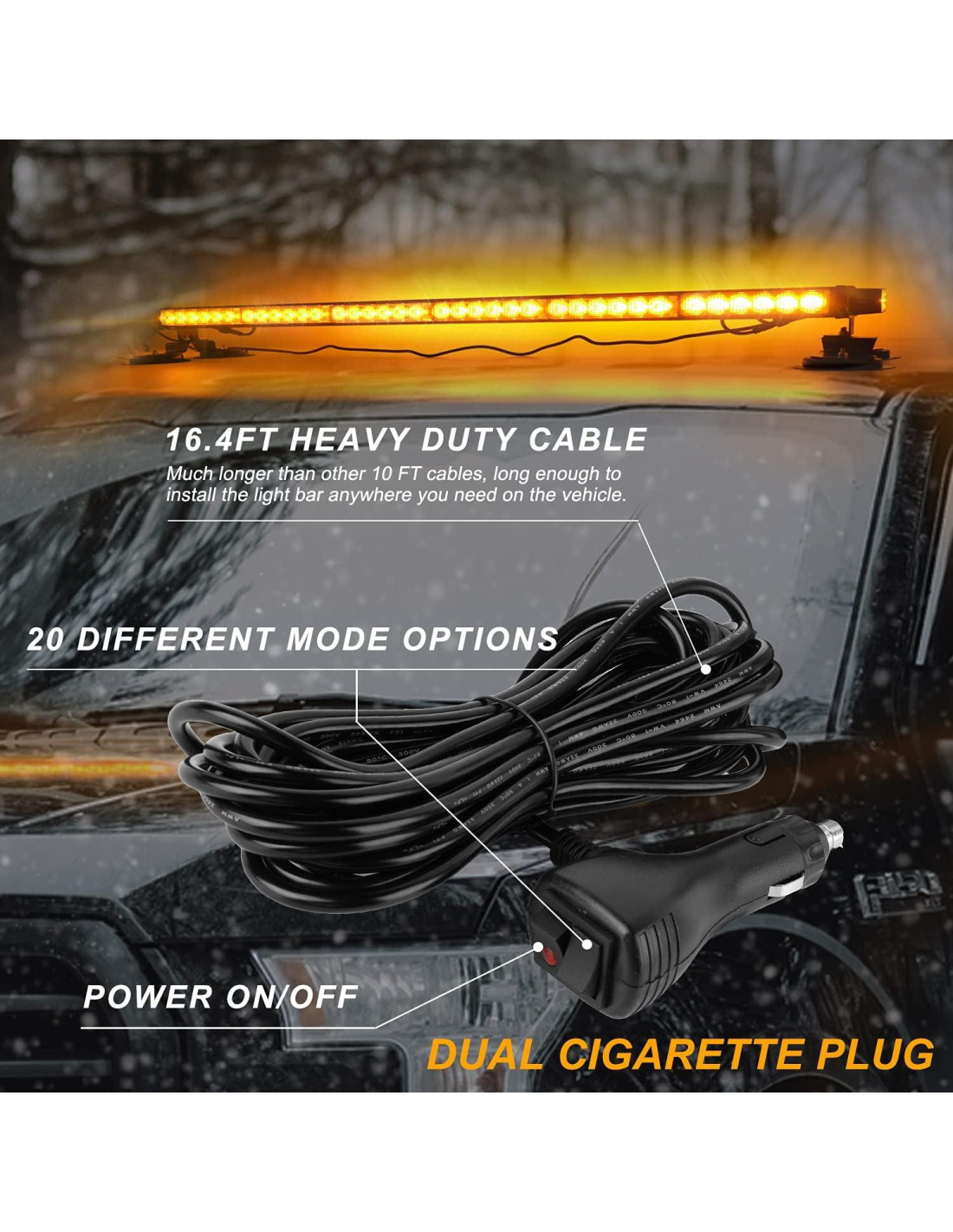 - [FÁCIL DE INSTALAR] 4 x 7 imanes fuertes con ventosas de goma más gruesas, más estables que otros imanes de 4 x 4. Muy rápido de montar sin dañar el techo de sus vehículos, además de agregar fuerza en la sujeción. Cable de 5 metros de alta resistencia y enchufe de 12-24V, lo suficientemente largo para instalar la luz en cualquier parte del vehículo.