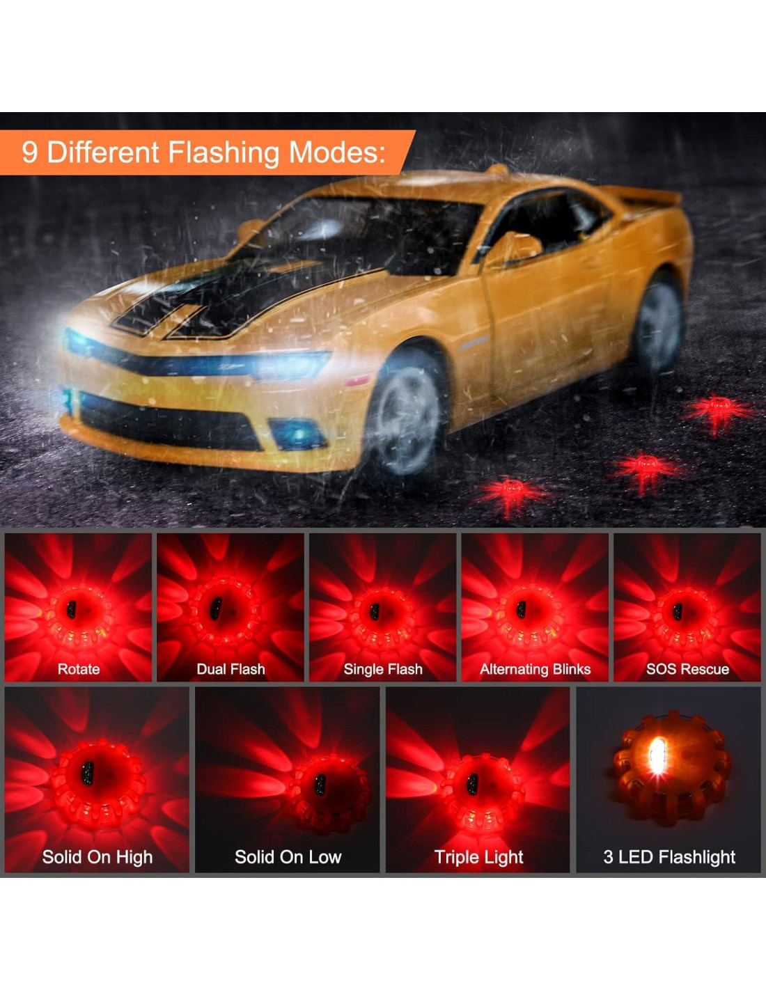 - 9 Modos de Destello de Emergencia Diferentes: estas bengalas de advertencia de disco tienen 9 patrones de destello para enviar señales de emergencia en diferentes situaciones (luz de rescate, luz de advertencia, luz de control de tráfico, etc.); Las 3 luces LED blancas en la parte superior pueden ser utilizadas como linternas, más visibles que las luces de emergencia de tu auto en mal tiempo
