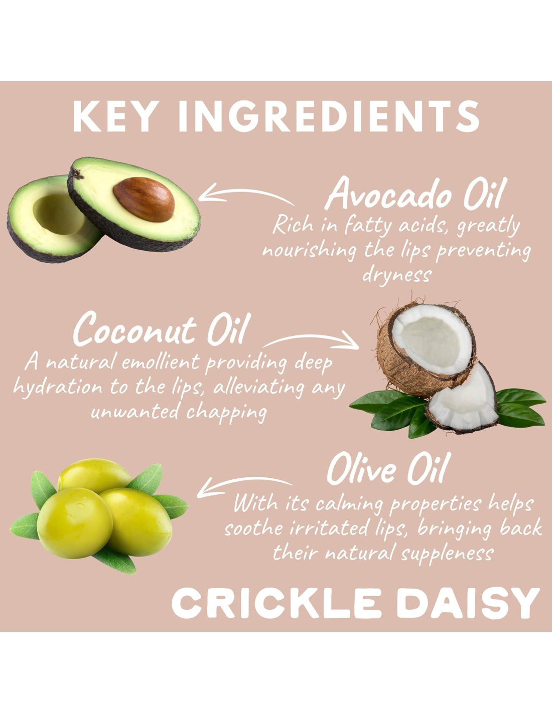 - HIDRATACIÓN INTENSA - Lleno de Aceites de Aguacate, Oliva y Coco para nutrir profundamente y prevenir la sequedad. Los Bálsamos Labiales Aromatizados de Crickle Daisy mantienen tus labios hidratados, suaves y lisos todo el día. Nuestros ingredientes veganos, libres de crueldad y de origen vegetal son una excelente opción para una rutina de cuidado de la piel limpia.