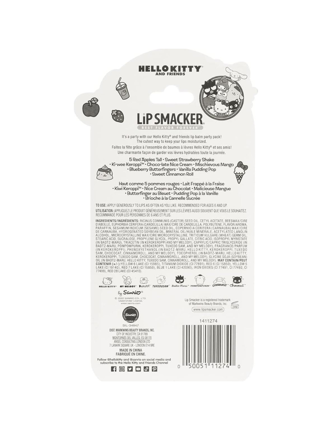 Di "Hola" a algunos de tus personajes favoritos de Sanrio en forma de este divertido paquete de 8 bálsamos labiales de Lip Smacker. ¡Hello Kitty se une a sus amigos, incluyendo algunos favoritos como My Melody, Little Twin Stars y Chococat! Con una variedad completa de deliciosos sabores disponibles, estos bálsamos labiales dejan los labios más suaves, más hidratados y instantáneamente más felices. Bienvenido al Mundo de Lip Smacker: Explora sabor, color y diseño y encuentra el Lip Smacker que te haga SONREÍR. Desde 1973, hemos puesto sonrisas en los labios de todo el mundo. Esperamos que nuestros sabores auténticos, aromas y productos diseñados coloridamente te hagan feliz. Te invitamos a descubrir Nuestro Mundo, explorar nuestra marca y encontrar tus favoritos. Las combinaciones de sabores son infinitas: mezcla y combina para encontrar tu propio momento feliz de suavizado de labios y sonrisa. Luego repite, repite, repite!