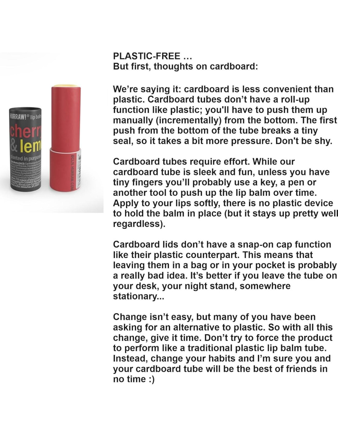 - TRES Tubos Redondos de Cartón de 4.8g/.17oz de Bálsamos Labiales HURRAW! empaquetados en una caja de almohada blanca con la marca HURRAW!. Cereza Limón, Coco Lima y Naranja Vainilla: Ahora en un formato de aplicador de cartón SIN PLÁSTICO. Sí... ¡podemos salvar nuestro PLANETA! Hecho con ingredientes orgánicos, veganos y crudos certificados. Los Bálsamos Labiales Hurraw! están certificados 100% de origen natural, libres de crueldad y gluten. No OGM. Libre de Abejas, Karité, Soja y Palma.