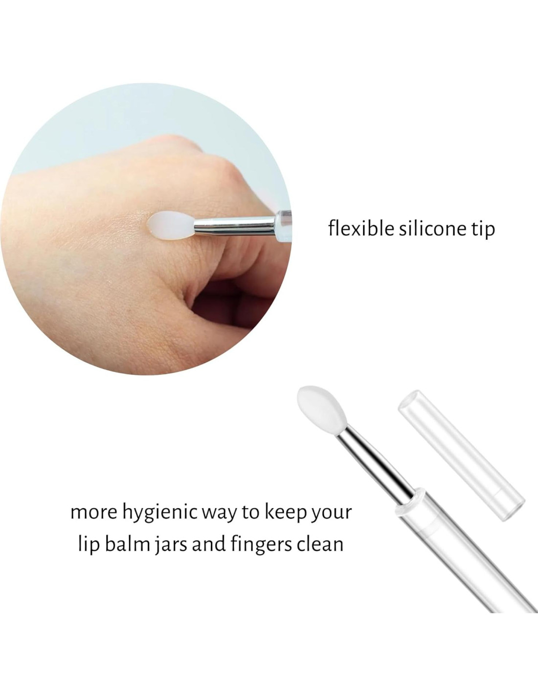 - Incluye una brocha de silicona para labios como bono con tapa. Mantén tus bálsamos labiales limpios usando una brocha de aplicación higiénica. La punta de silicona es fácil de limpiar con jabón y agua.