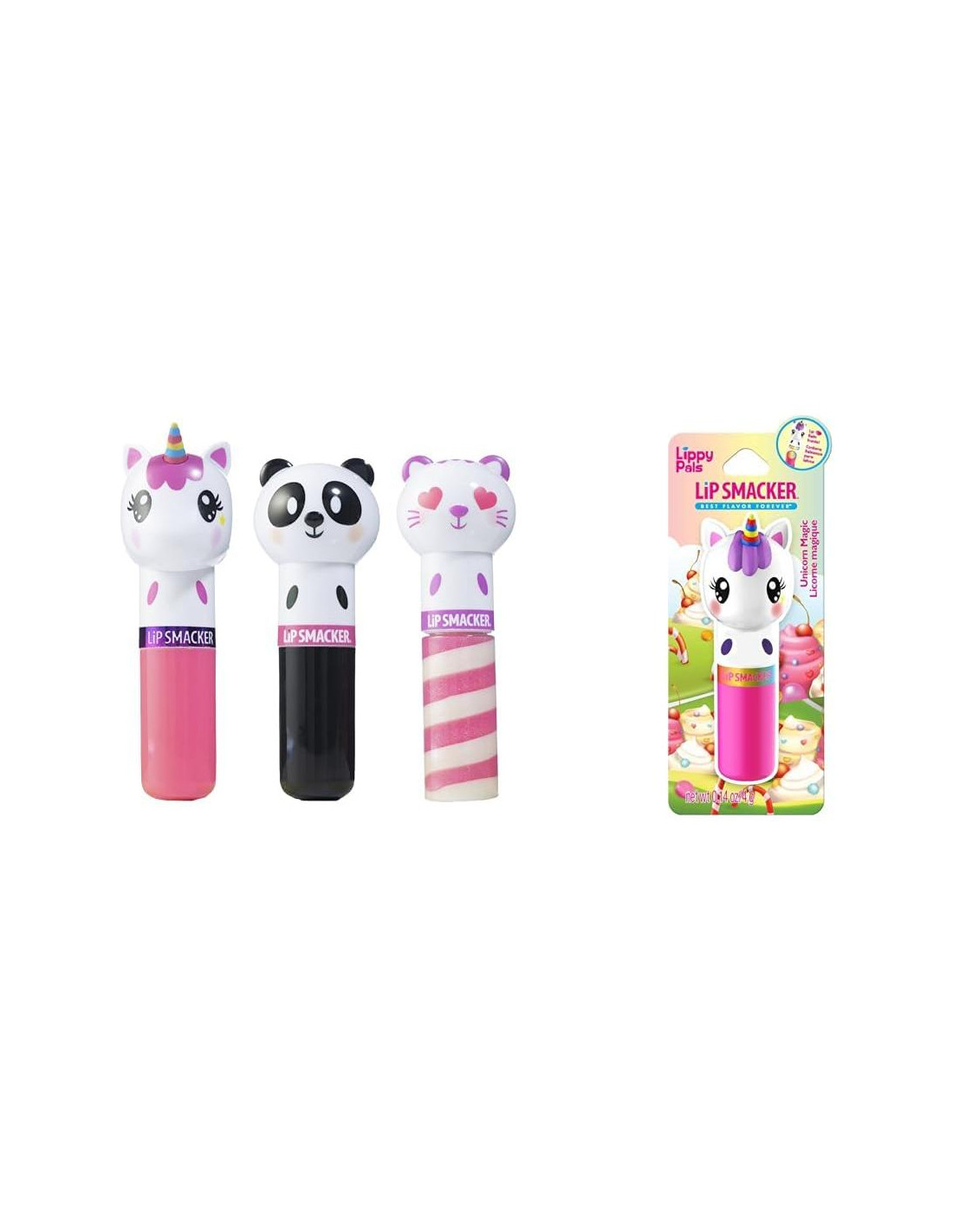 Este conjunto de bálsamos labiales de 3 piezas de Lip Smacker incluye sus populares Lippy Pals en divertidas formas de animales junto con un brillo labial. El primer componente es un conjunto de 3 bálsamos labiales en las formas de un unicornio, panda y gatito. Estos cuentan con fórmulas hidratantes para sanar los labios agrietados en sabores dulces como Magia de Unicornio, Crema Puff Acurrucada y Gatito Kiwi Dulce. El segundo componente es un bálsamo labial en forma de unicornio con el sabor Magia de Unicornio. Todos los bálsamos proporcionan un sutil brillo brillante mientras protegen y suavizan los labios. Estos adorables bálsamos labiales en forma de animales se complementan perfectamente para mantener tus labios saludables y felices. El conjunto de 3 piezas te permite descubrir una variedad de sabores y compartir con amigos. Combínalo con el bálsamo de unicornio individual para siempre tener el mágico sabor Magia de Unicornio a mano para ti. Con sus fórmulas hidratantes y su divertido empaque, estos productos son grandes regalos así como cuidado labial diario. ¡Explora el Mundo de Lip Smacker y haz crecer tu colección de bálsamos labiales con estos divertidos conjuntos!