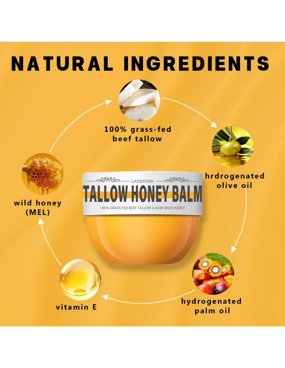 - [100% Ingredientes Naturales y Puros] Nuestro bálsamo de miel y manteca está elaborado con ingredientes simples y poderosos: 100% manteca de res alimentada con pasto, miel silvestre cruda, aceite de oliva hidrogenado y aceite de palma hidrogenado. Una pequeña cantidad aplicada se extenderá y será muy hidratante.
