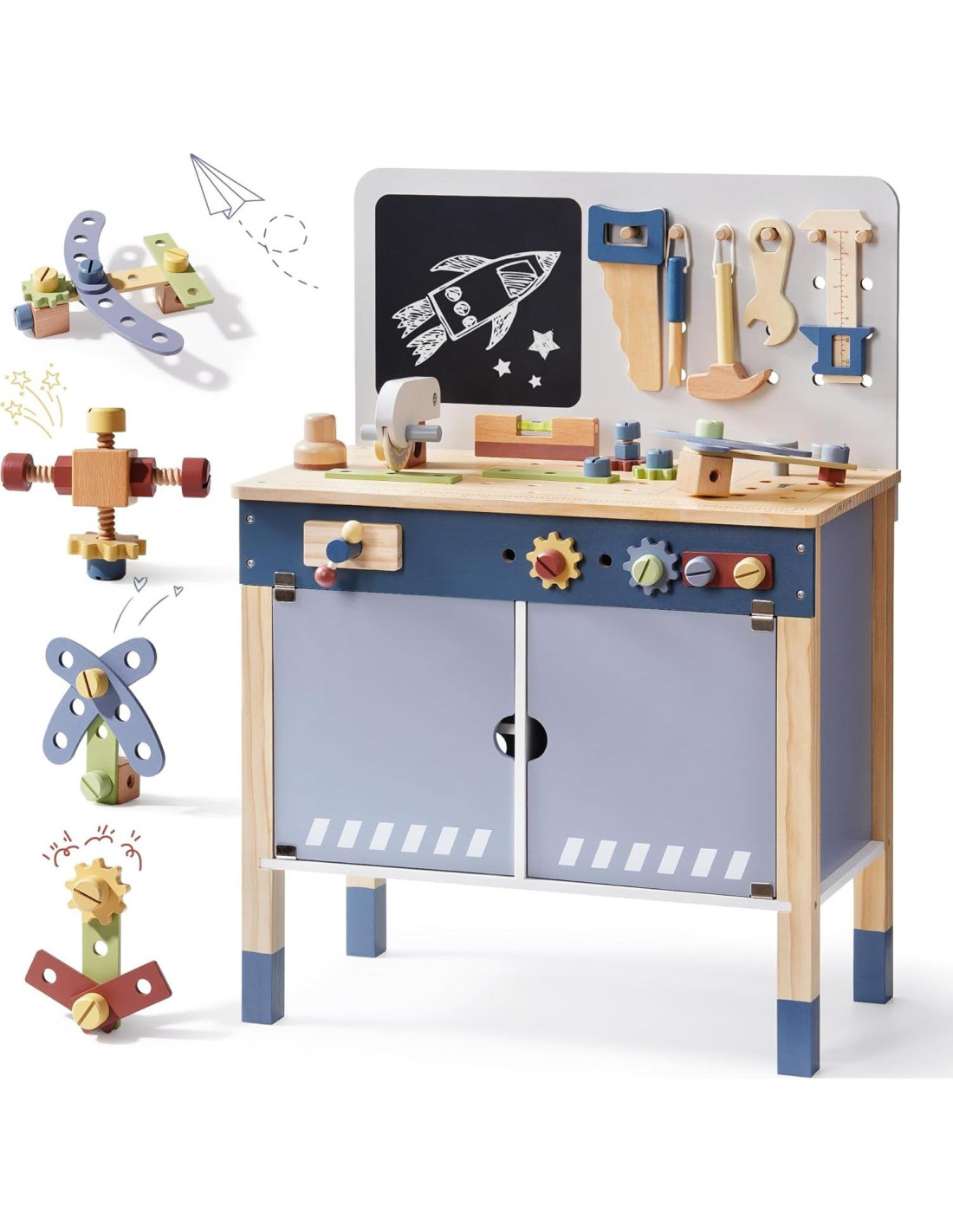 - Regalo ideal para pequeños constructores: Ya sea para un cumpleaños o una festividad, el banco de trabajo de madera es un excelente regalo. Es un juguete versátil que tanto niños como niñas disfrutarán, inspirando su amor por la construcción y la exploración.