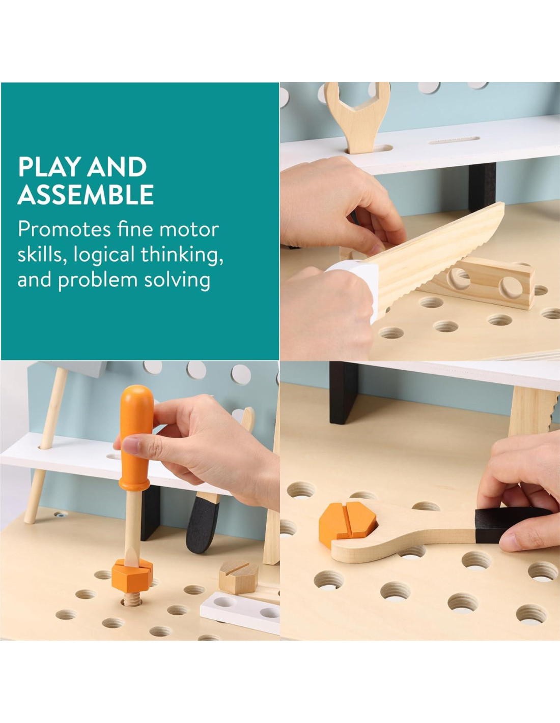 - SEGURIDAD: Este es un banco de herramientas de madera para niños cuidadosamente trabajado, adecuado para niños a partir de 18 meses.