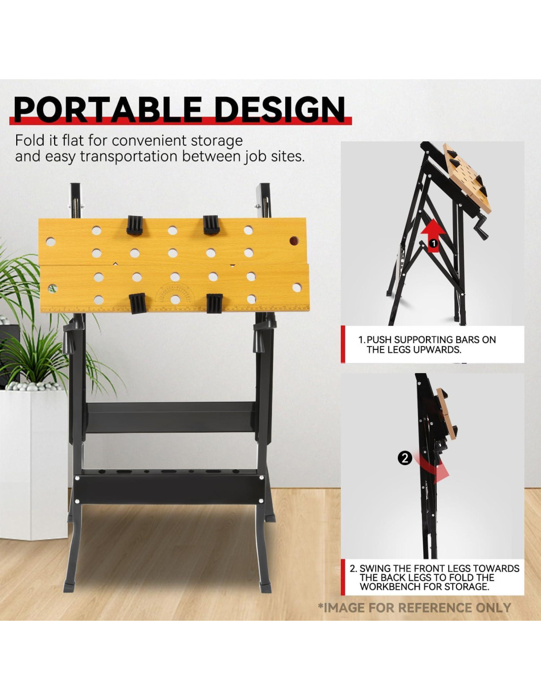 - Almacenamiento y movilidad convenientes - Pliegue fácilmente el banco de trabajo empujando la varilla de soporte para un almacenamiento compacto. Muévalo rápidamente entre ubicaciones de almacenamiento y trabajo, mejorando la eficiencia laboral sin ocupar espacio adicional.