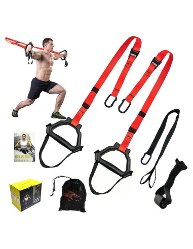 - Componentes incluidos: Correas de Entrenamiento de Resistencia Ajustables, Ancla de Puerta, Correa de Extensión, Guía de Entrenamiento Deportivo