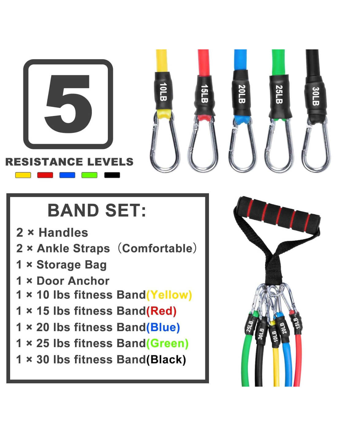 - Diferente Color: Amarillo (4.54 kg), Rojo (6.8 kg), Verde (9.07 kg), Azul (11.34 kg), Negro (13.6 kg). Todas las bandas de ejercicio se pueden usar solas o apiladas en cualquier combinación hasta un máximo equivalente de 45.36 kg.