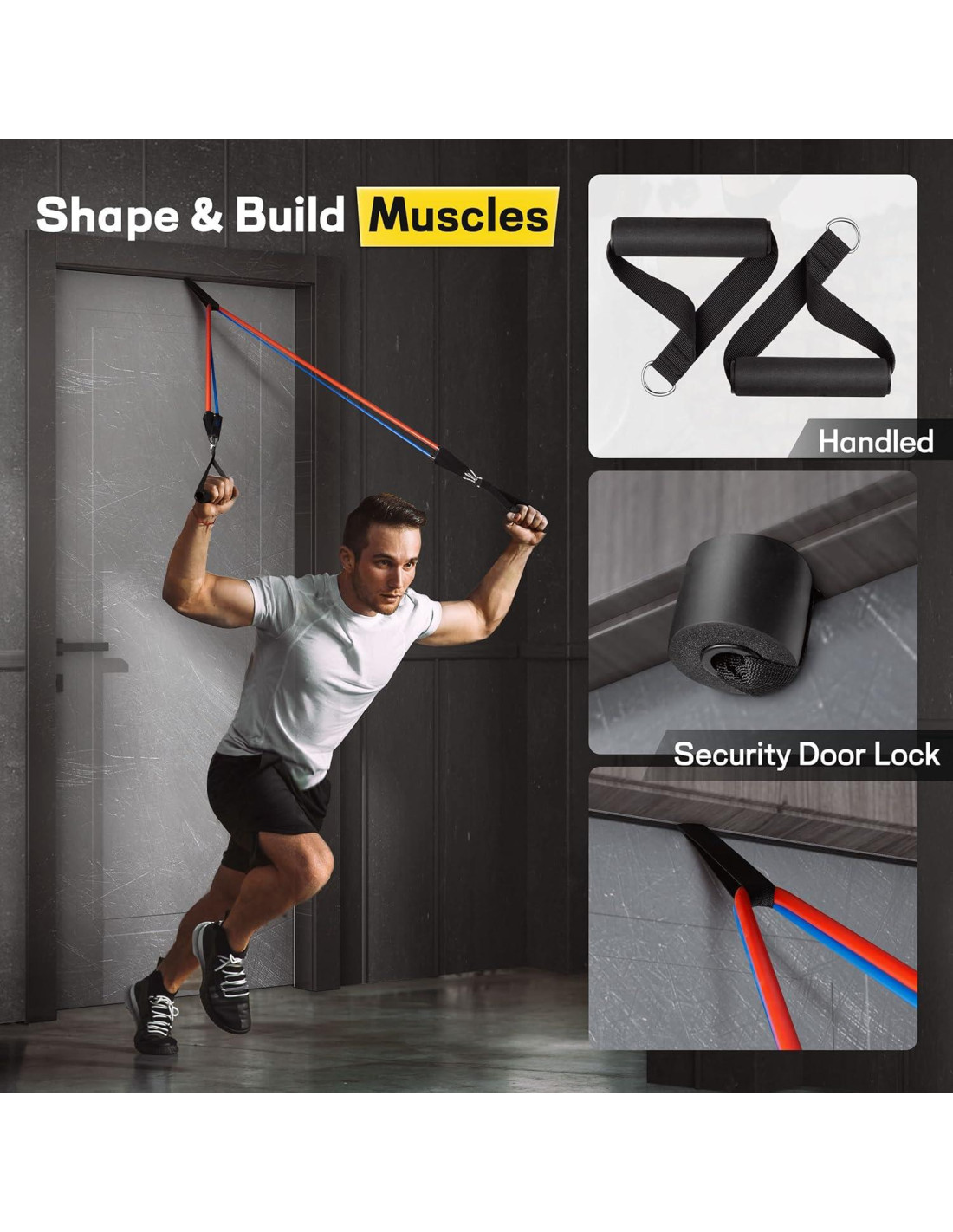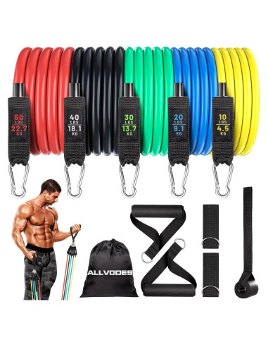 - Lo que obtienes: El juego de bandas de resistencia incluye 5 bandas deportivas con diferentes resistencias, 1 ancla de puerta, 2 mangos acolchados, 2 correas de tobillo, 1 guía de ejercicios y 1 bolsa de transporte impermeable.