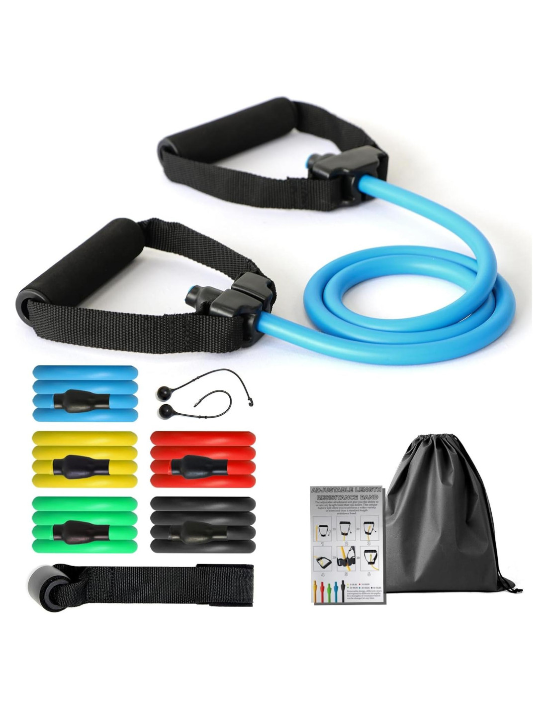 - GIMNASIO PERSONAL EN CASA: Nuestro conjunto de bandas de resistencia con mango incluye 5 bandas de ejercicio, 1 ancla para puerta, 2 mangos de esponja, bolsa de transporte y manual de usuario para permitirte realizar la mayor variedad de ejercicios de entrenamiento de resistencia posible en cualquier lugar. Nuestros mangos de bandas de resistencia vienen en diferentes niveles de resistencia: amarillo (2.3-4.5 kg), rojo (6.8-9.1 kg), verde (9.1-11.3 kg), azul (11.3-13.6 kg) y negro (15.9-22.7 kg), todos midiendo 139.7 cm de longitud.