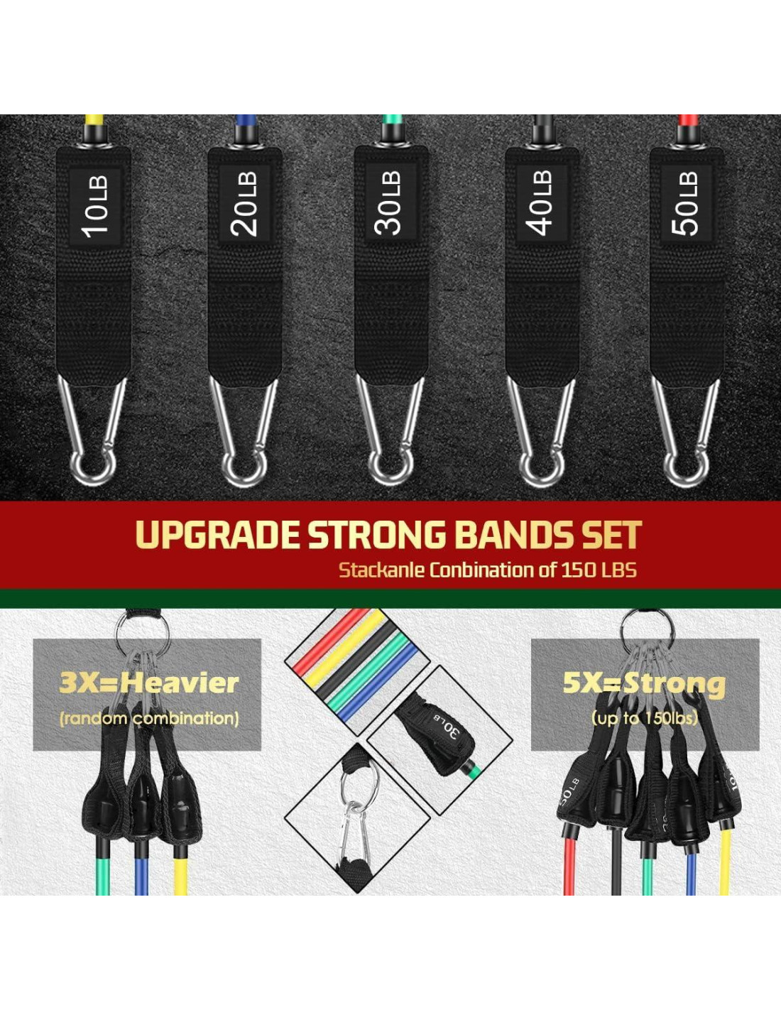 - Bandas de Resistencia Ajustables, Máximo equivalente a 68 kg - Viene como un conjunto de 5, bandas de ejercicio de 122 cm de largo: Amarillo (4.5 kg), Azul (9 kg), Verde (13.5 kg), Negro (18 kg), Rojo (22.5 kg). Puedes usar las bandas de forma independiente o en cualquier combinación con un nivel máximo de resistencia de 68 kg.