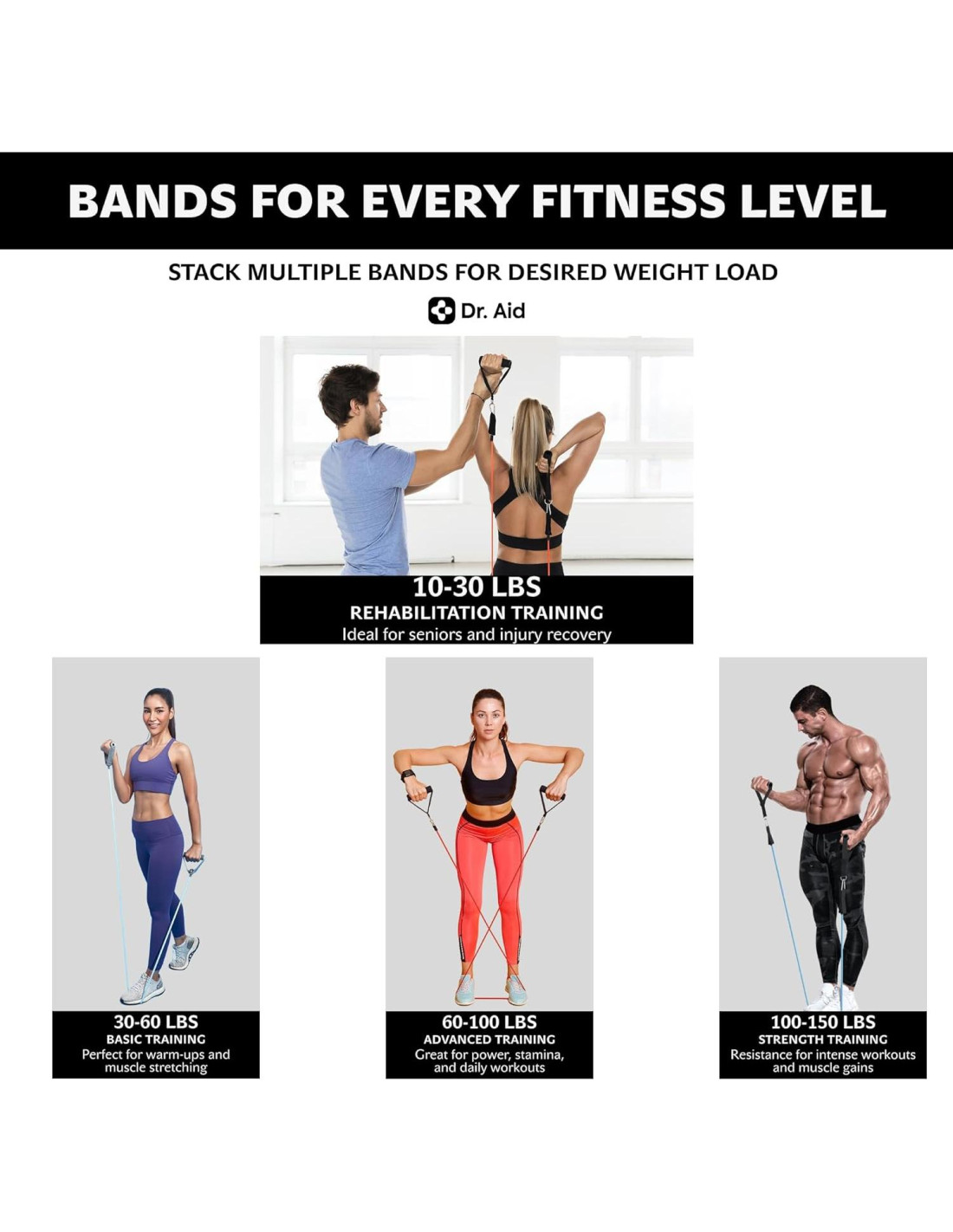 - Bandas elásticas para ejercicio en cualquier nivel: El set Dr. Aid incluye 5 bandas elásticas para ejercicio con diferentes niveles de resistencia, perfectas para hombres y mujeres. Cada banda elástica para ejercicio se puede usar para entrenamiento de fuerza, rehabilitación, estiramiento, pilates y rutinas en casa. Con asas, correas para tobillo, anclaje para puerta y bolsa de transporte, este set es ideal para entrenar todo el cuerpo en cualquier lugar.