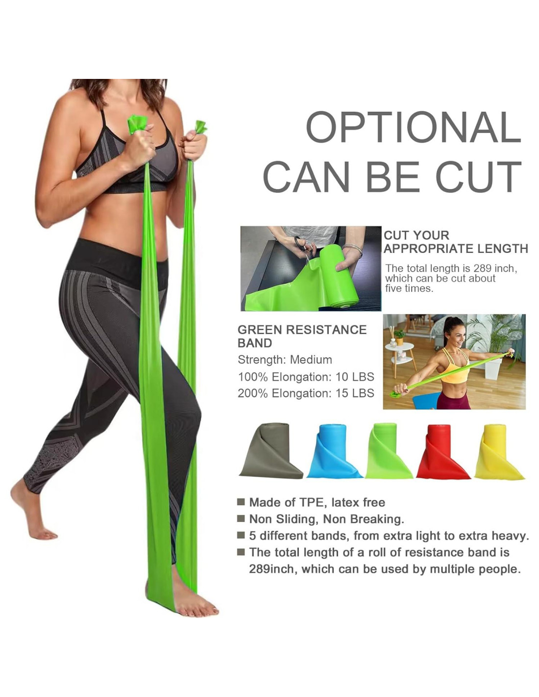 - Rollos de banda de resistencia verde: Desde principiante hasta avanzado, hay 5 colores de niveles de resistencia progresiva para elegir. El verde representa el nivel de resistencia: Medio, 0.35mm. Longitud y ancho: 60in (152,4 cm) x 6in (15,24 cm). Se puede cortar y personalizar según tus propias necesidades, un rollo de banda de ejercicio se puede cortar muchas veces.