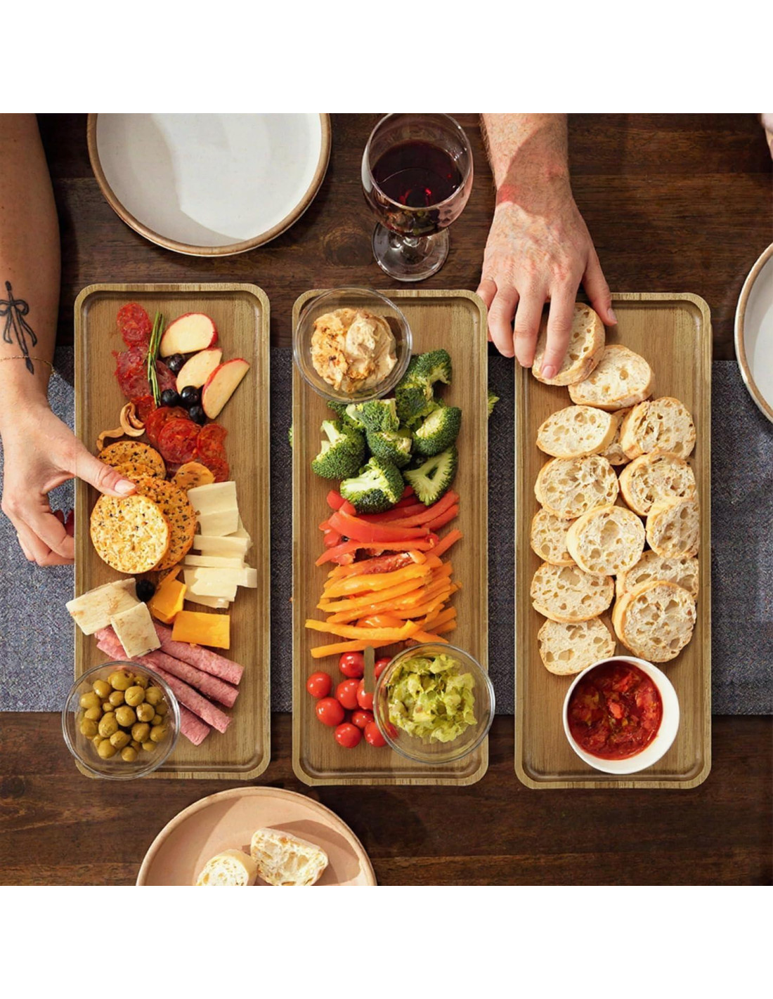 Con nuestra bandeja de madera de acacia estarás más que satisfecho porque nuestra prioridad es la calidad, el diseño hermoso y la funcionalidad! DIMENSIONES Bandeja: 35.1 x 14 x 1.5 cm CARACTERÍSTICAS DEL PRODUCTO Hecho de madera de acacia duradera Superficie lisa resistente a manchas y olores Fácil de limpiar Ideal para servir y decorar Adecuado para todas las ocasiones Paquete: 3 Bandejas ESTE PLATO ES GENIAL PARA VARIOS TIPOS DE COMIDA PLATOS PRINCIPALES Y APERITIVOS lucirán perfectos en la bandeja y a tu familia y amigos les gustará en todas las ocasiones, fiestas al aire libre e interiores, vacaciones, BBQ, buffets o eventos de catering También puedes usarlo como bandeja organizadora para té, café, jugo o tocador de baño.