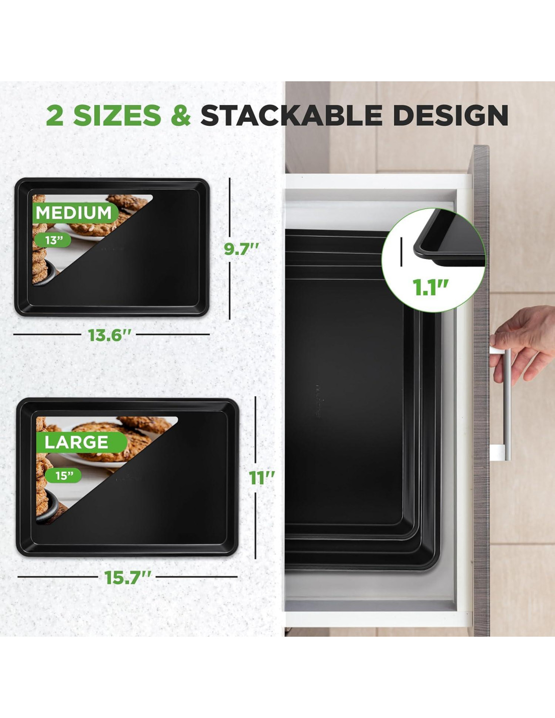 - BANDEJAS PARA GALLETAS VERSÁTILES: Las bandejas para galletas antiadherentes de larga duración proporcionan una excelente liberación de alimentos al hornear, cocinar, etc., y facilitan la limpieza. Apta para lavavajillas y de larga duración. También es un diseño de bandeja ancha apilable que ahorra espacio